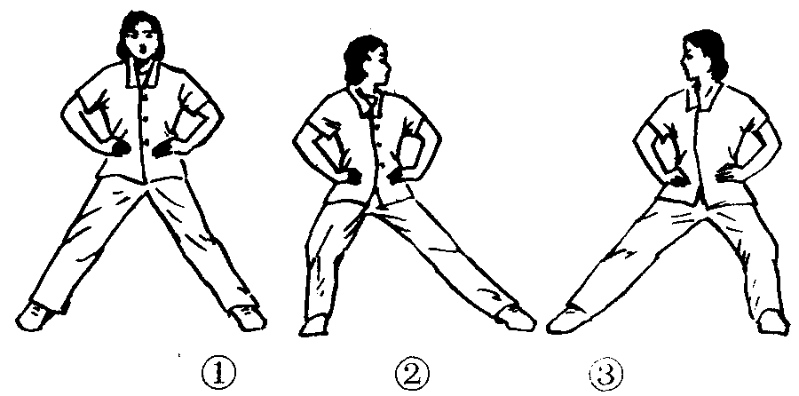 练功十八法第3套第2节。动作过程:两脚分立一大步,双手叉腰,拇指向后。(图2—4—134—❶)❶右腿成仆步,同时上体向左转约45°。(图2—4—134—❷)❷还原成开始预备姿势。❸❹动作与❶❷相同,但方向相反。(图2—4—134—❸)共做4个8拍。注意事项:做仆步时上体保持正直。此功法对腰、臀、腿痛以及髋、膝关节活动不便都有一定的治疗效果。