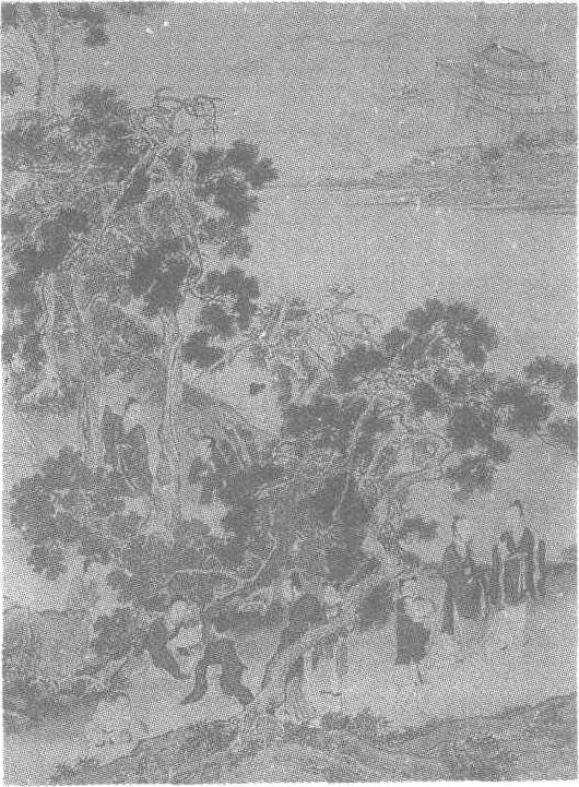 | 释义 | 仇英人物故事图册 仇英人物故事图册明。仇英(见《仇英停琴听阮图轴》条目)绘。绢本重设色。纵41.1厘米,横33.8厘米。北京故宫博物院藏。全册共十页,各页分别署“仇英实父”、“仇英”、“实父”等款,画“明妃出塞”、“贵妃晓妆”、“子路问津”、“吹箫引凤”、“南华秋水”、“高山流水”、“竹院品古”、“松林六逸”、“捉柳花图”、“浔阳琵琶”。所画人物故事多属常见的传统题材。如“竹院品古”,是描绘文人日常生活的题材。在庭院中,棵棵翠竹挺拔密集,竹叶郁茂。湖石玲珑剔透,巧夺天工。竹林间,一童子正往石桌上摆放围棋盒,几只小动物追逐嬉耍,富于野趣。近处两扇绘有图案的屏风、栏杆将竹院隔开,三位文人围坐桌前,桌上放有翻开的画册和画轴,地上、几案上摆放许多古玩,有青铜器、瓷器、古琴等物,以备赏玩。几名童子、侍女有的煮茶,有的肩扛、手抱器物分侍左右。环境幽雅,器物刻画精细,人物表情各异,神态恬淡闲逸。这幅文人雅士品玩古物的行乐图,真实地反映了当时贵族士大夫阶层的精神风貌。“贵妃晓妆”,所画贵妃姿容秀美,华贵雍容,精丽艳逸,通过听乐、梳妆、采花等场景,表现出杨贵妃在宫中奢糜的生活。此册工笔重彩,用笔精工,笔墨娴熟,纤丽飘逸,是仇英精心之作。