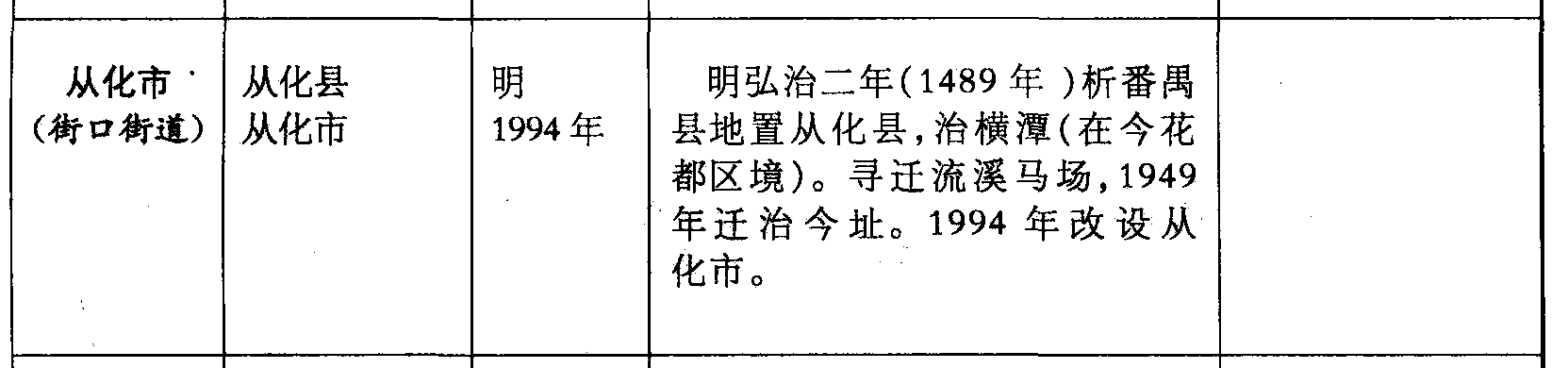 从化市(街口街道)从化县从化市明1994年明弘治二年(1489年)析番禺县地置从化县,治横潭(在今花都区境)。寻迁流溪马场,1949年迁治今址。1994年改设从化市。