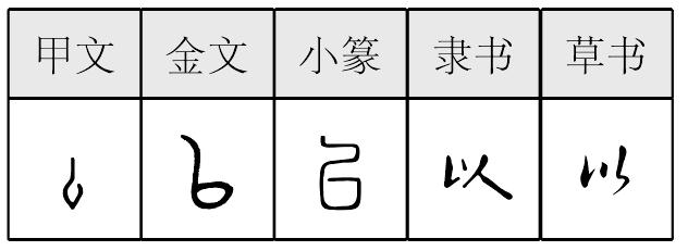 ❹ 不知所以|忘乎所以|忘其所以 以以,甲骨文作   ,金文作 ,小篆作 。 甲骨文第一字形象人手提一物,第二字形省去人形,第三、四字形是第二字形的變體。本義是拿着、携帶或拿物送人,引申爲帶領、使用等義。後轉化爲介詞、副詞、連詞。卜辭或用本義,銘文及後世文獻多用引申義。 早期文獻多作 “㠯”,與“嗣” “巳” “似”四字多通用。 楚簡帛文作 ,沿襲古體。秦簡牘文作 ,古隸典型。 以 甲骨文; 金文; 篆yǐ[象形,用力拽。後訛爲厶。(《説文》:“ ,用也,從反巳。賈侍中説:‘巳,意已實也。象形。’” 以,用,拿,把,將〈以一當十、以苦爲樂、以身作則、以鄰爲壑、以訛傳訛、以往鑒來〉;依然,順,按照〈以時啟閉,物以類聚〉。)] 《詩經·邶風·旄丘》:“何其久也?必有以也。”(拖延這麼久,必定有緣由。) 《禮記·儒行》:“禮之以,和爲貴。” [戰國] 韓非《韓非子·揚權》:“聖人執要,四方來效,虛而待之,彼自以之。” 以㕥;㠯 yǐ(4画)