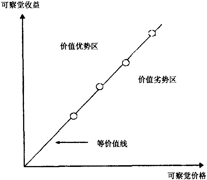 顾客矩阵的另外一种称谓,是企业产品定位和定价中实施“动态价值管理”的一种重要分析工具。动态价值管理方法认为,所谓的顾客价值,是企业产品给予顾客的收益与其要价的差额,即顾客可察觉收益(Customer Perceived Benefit)减去顾客可察觉价格(Customer Perceived Price)。价值地图(见图3-12)将这两个指标分别作为其纵轴与横轴,从而分析企业及其竞争者产品的不同分布、竞争地位,以及可采取的竞争策略。利用价值地图,可进行静态价值管理和动态价值管理。所谓动态价值管理,即考虑竞争者在价值地图上的定位和顾客对可察觉价值的可能变化等因素,而采取相应的价值定位策略和市场行动。一般有两类,即在现有等价值线上的重新定位,或者离开某一等价值线向价值优势区域或劣势区域移动。采取这些行动要求企业预先考虑顾客的真实需要、竞争者的可能行动,以及作为竞争者行动结果的需求的可能变化等因素。