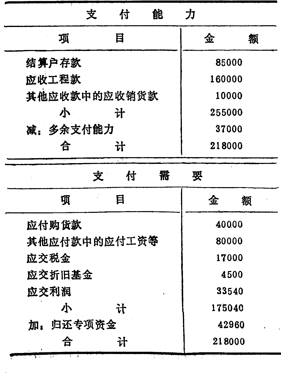 上表说明,定额流动资金占用其他资金来源110000元,其中占用非定额流动资金67040元,占用专项资金42960元。 支付能力与支付需要是相对的。企业的支付能力还应从现有支付能力和近期获得的支付能力两方面看。现有支付能力虽大,而近期支付能力不足,加在一起满足不了近期的支付需要,不能认为有足够的支付能力;反之,现有支付能力虽不足,但近期支付能力较强,加在一起,可以满足近期的支付需要,应认为有足够的支付能力。现有的支付能力主要指现有的结算户存款。近期支付能力则要从定额流动资产和其他流动资产中可以“变现”的项目分析计算。近期支付需要包括:应付购货款、其他应付款中的应付工资和应交工会经费,应交未交的利润、税金、折旧基金等项。支付能力与支付需要的比较,可根据“资金平衡表”有关项目及明细帐资料,列表如下: