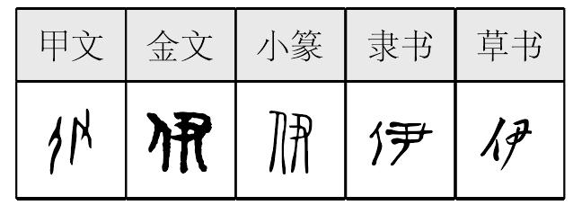 伊 甲骨文; 金文; 篆yī[亻(意符)+ 尹(意符)→ 伊(《説文》:“伊,殷聖人阿衡。尹治天下者。從人,從尹。”在古代伊與“醫”音近意通。後借爲人稱用語,表示他。“五四”後的文學作品中專指女性第三人稱“伊”,後改用“她”。伊川出土夏朝酒器,經碳十四測定爲公元前1840—前1880年,證明當時杜康在伊川創天下第一美酒——杜康酒的史實。)] 《詩經·邶風·谷風》:“不念昔者,伊餘來塈。”(前情你都忘懷,你我也曾有過恩愛。) 伊*yī(6画)