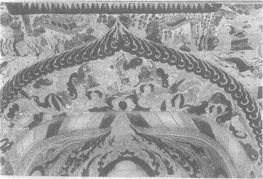北周。纵70厘米,横157厘米。甘肃省敦煌县莫高窟第299窟西壁壁画。图中有生动流畅的忍冬花丛,花丛中伎乐在欢快地奏乐、舞蹈,形式十分随意,姿态自如舒适。两旁有化生、猕猴及孔雀,两只猕猴正在追逐嬉戏,尤为有趣。整个画面充满自由、活泼的欢娱气氛。图中的花丛使用了不同色彩表现层次,人物也有局部晕染,增添了画中景物的主体感。