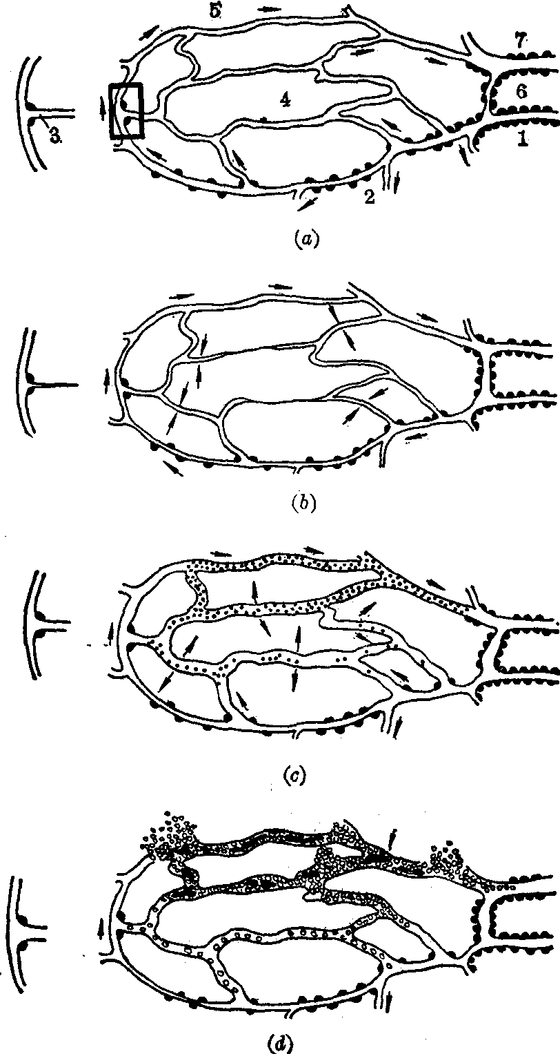 休克过程中微循环障碍的演变 (a)正常; (b)缺血性缺氧期。动脉、微动脉、毛细血管前括约肌及小静脉均收缩,开放的毛细血管减少,血流经直捷通路和动-静脉吻合支。毛细血管内流体静压降低,组织液流入血管;(c)淤血性缺氧期。毛细血管前括约肌松弛,小静脉仍收缩,毛细血管静脉端及微静脉淤滞扩张,血管内流体静压增高,血浆外渗;(d)微循环衰竭期。毛细血管静脉端及微静脉内出现微血栓, 并有出血及组织坏死 1.微动脉; 2.后微动脉; 3.毛细血管前括约肌; 4.真 毛细血管; 5.直捷通路; 6.动-静脉短路; 7.小静脉 与微循环衰竭期相应的临床表现,除血压进一步降低外,还出现出血、微血管病性溶血性贫血和器官功能严重障碍。休克发展至此期,单纯输液及应用扩血管药物,往往不能奏效,必须同时针对播散性血管内凝血采取相应措施。 随着休克进一步发展,细胞代谢及功能障碍也更为严重。细胞内线粒体受损,三羧酸循环运行障碍,三磷酸腺苷生成明显减少,血中乳酸盐和乳酸/丙酮酸比值增高。细胞膜钠-钾泵因能量缺乏而功能降低,结果导致细胞内钠、水增多,引起细胞水肿。此外,细胞内溶酶体膜受损,释出各种水解酶,进一步损伤组织。临床上常测定血中乳酸含量及溶酶体酶活性,作为判断休克严重程度的指标。一般认为,乳酸含量如超过10mEq/L,则提示预后不佳。测定血中酸性磷酸酶、β-葡萄糖醛酸酶及组织蛋白酶等活性,可以反映溶酶体受损情况;测定血中乳酸脱氢酶、谷丙转氨酶、谷草转氨酶等活性,可以反映休克时细胞坏死的情况。 休克时的全身性代谢变化主要的有: ❶酸中毒。一般休克可因缺血、缺氧而发生代谢性酸中毒(感染性休克早期,常因通气过度而出现呼吸性碱中毒)。乳酸血症是休克恶化的重要原因,可产生严重后果:降低血管平滑肌对血管活性物质的反应; H+与心肌内Ca++争夺肌钙蛋白的结合部位,影响心肌收缩力;使血管内皮细胞受损,促进播散性血管内凝血。 ❷血糖变化。休克早期儿茶酚胺和胰高血糖素分泌增加,促进糖原异生作用。血糖升高有利于保证重要器官代谢的需要,具有代偿意义。休克晚期,糖异生能力减弱,以及葡萄糖利用增多而导致严重低血糖。 ❸蛋白质分解加强。全身肌肉特别是骨骼肌及血浆蛋白分解加强,同时肝脏糖异生作用减弱,因此血中氨基酸浓度增加,尿氮排出增多,出现负氮平衡。伴有严重损伤时上述变化尤为突出。 ❹脂肪分解加强。这与儿茶酚胺分泌增加有关。血中游离脂肪酸增多。脂肪酸是休克晚期能量的主要来源。严重外伤时能量消耗的75~95%来自脂肪氧化。内毒素休克时心肌摄取游离脂肪酸及脂肪氧化均受到抑制,在内毒素休克发生机制中具有一定意义。 休克时,可致各器官的功能或结构改变。主要器官的变化如下: (1) 肾: 休克时肾可发生一系列功能、代谢和结构的变化,此时的肾脏称为休克肾。肾功能衰竭是休克致死的重要原因之一。病人主要表现为少尿或无尿,常伴有体内氮质潴留及电解质和酸碱平衡紊乱。尿量改变是临床上观察休克病情、间接衡量肾脏微循环血流状态的一个重要指标。休克时尿少的主要原因是: ❶肾小球灌流压和滤过率降低。 ❷肾血流重新分配。正常时肾脏90%的血流流经肾皮质。休克时由于神经反射及肾上腺素、去甲肾上腺素和血管紧张素等的作用,皮质血流显著减少。 ❸休克晚期,由于持续缺血,肾小管上皮细胞坏死脱落,阻塞管腔并引起原尿返流。感染性休克时肾内微血管内可形成微血栓; 挤压伤时肌红蛋白可在肾小管内形成管型;盲目或过量使用缩血管药物,可严重影响肾功能,导致“不可逆”休克而死亡。近年研究证明,肾缺血时可从肾脏释放体液因子促使休克恶化。 (2) 肺: 休克病人经抢救后,血液动力学变化虽已恢复正常,但仍可因突发呼吸困难,动脉血氧张力进行性下降而死亡。尸检时发现主要病变为双侧肺显著充血、水肿,湿重可达正常肺重的3~4倍。镜下可见肺间质水肿、肺泡内透明膜形成及灶性肺不张。休克时出现的上述临床表现及肺部的病理特征,称为休克肺,多见于感染性休克和创伤性休克。单纯失血性休克,如不伴有严重损伤,则较少发生休克肺。休克肺的发生机制至今意见不一,目前认为可能与下列因素有关: 正常肺循环的特点是压力低、阻力低及血流量多,对全身血液动力学变化较为敏感。休克时交感神经-肾上腺髓质系统兴奋,血中肾上腺素、去甲肾上腺素以及血管紧张素和组胺等的浓度增高,可使肺血管,特别是肺小静脉强烈收缩,肺动-静脉短路开放,肺分流量从正常心输出量的2%增至10~20%或更高。由于肺血流减少,Ⅱ型肺泡上皮细胞分泌的表面活性物质减少,可导致灶性肺不张。肺血管及支气管周围的肥大细胞可因缺血和缺氧而释出大量组胺等血管活性物质,使肺泡壁中毛细血管壁的通透性增加,首先出现肺间质水肿,进一步发展时肺泡内可出现渗出物,渗出物中蛋白质凝固形成透明膜,影响气体交换。此外,近年证明休克肺与来自外周血液的血小板和(或)白细胞微聚物贮留于肺毛细血管引起内皮细胞损伤有关。休克肺形成也可能与某些不当的医疗措施有关,如输液过多,吸入过高浓度的氧,输入陈旧的库存血以及人工呼吸过度等。由于休克肺内有动-静脉短路的存在,治疗时单纯吸氧难于奏效,应用人工辅助呼吸,如呼气末期正压呼吸,有助于消除肺水