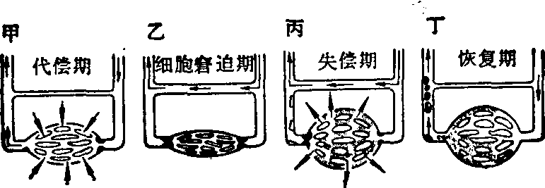 图1 休克时微循环改变 甲、代偿期: 毛细血管前括约肌收缩、管内滤过压降低,液体回收。 乙、细胞窘迫期: 动静脉分流开放,毛细血管后括约肌关闭,无液体进出。 丙、失代偿期: 毛细血管前括约肌开放,后括约肌仍然关闭,液体自受损的毛细血管床丧失,管内红细胞发生凝聚。 丁、恢复期: 容量恢复正常,毛细血管前后括约肌均开放,红细胞凝块、聚集的血小板和白细胞冲洗入体循环。 (2) 细胞障碍: 维持细胞与周围间质液体间的离子差需要能量,这些能量用以维持细胞内钾与细胞外钠浓度,细胞营养减少招致细胞能量减少,细胞工作减少并使细胞膜受到休克的损伤,钠移入细胞和钾移出,水亦随钠离子而进入细胞招致水肿,血清钠下降和血清钾上升。 根据休克的严重程度,线粒体和溶酶体分解微粒的膜发生肿胀以致最后破裂,一旦溶酶体膜破裂,酸性磷酸酶和脱氢酶进入细胞体,引起细泡器进一步受损,其中一些酸性磷酸酶可引起全身性中毒症状。线粒体破裂引起第三期呼吸活力 (二磷酸腺苷-依赖)抑制,三磷酸腺苷酶活力减低和能量-依赖的钙运转减少。氧化磷酸化作用受抑制,反映在细胞色素活力的降低,内质网和肌浆网可见更多膜的改变,在激感的细胞——特别是心肌——这些结构的改变能使收缩机理受障,当低灌注状态进展,兴奋-收缩耦联就会发生改变,引起心律失常和收缩力降低。 中枢神经系统细胞缺氧引起过度换气伴有呼吸性碱中毒,以后有无氧代谢和乳酸盐积累,当肾脏代偿机制失效,就会有代谢性酸中毒,一系列恶性循环也就同时开始(图2)。