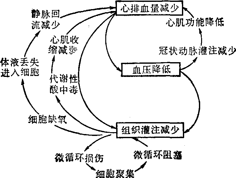 图2 休克时恶性循环示意 (3) 代谢障碍: 休克时细胞代谢受抑制,最后走向死亡时,所有代谢停止,在完全虚脱和死亡前,各代谢因素有不同的障碍。 ❶碳水化合物代谢障碍: 儿茶酚胺增多引致肝脏糖元分解增加使血糖增高。灌注不足使细胞中有氧代谢转向无氧代谢,葡萄糖的代谢途径受累,在转变到丙酮酸之后中断,然后乳酸盐释放小量高能量的三磷酸腺苷。这是一个效率很低,但在缺氧条件下能够产生能量的代谢途径。休克持续时,血乳酸增加,如肝脏有足够的灌注,乳酸可在该处进一步代谢,否则,随着乳酸的积累,酸中毒将加剧。 ❷脂肪代谢障碍: 因儿茶酚胺引致脂肪分解而发生变化。组织脂质和血清甘油三酯转变为游离脂肪酸,使血液中游离脂肪酸增高。 ❸蛋白质代谢障碍: 因蛋白分解增加以及细胞破损,血尿素、血清肌酐和血清尿酸增加。 (4) 播散性血管内凝血: 在休克发展过程中,微循环遭受损害的毛细管易于发生纤维蛋白沉积和血小板凝集,凝集的血小板分解放出促凝物质促使纤维蛋白沉积,并可沉积于红细胞表面,使红细胞凝集成团,形成微血栓,使微血管阻塞,助长血管内液体外渗,以致回心血量减少,心排血量下降。由于血管内凝血过程中过多消耗血中的凝血因子,造成凝血因子不足而产生出血倾向,可引起广泛的内脏出血和渗血。 (5) 呼吸窘迫综合征(respiratory distress syndrome):休克时肺微循环障碍可招致“休克肺”,临床上称呼吸窘迫综合征,是肺血管渗透性增加,使肺脏含液量增加,肺间质水肿,肺泡功能低下,表面活性物质产生降低,透明膜形成所致。以后肺僵硬而顺应性下降,通气与血液比率失调,肺分流增加,引起进行性低氧血症和极度呼吸困难,吸氧亦难以纠正。因有严重的出血性实变,肺微循环内可有微栓子,由细胞碎片、白细胞或血小板形成,可能是引起休克肺的因素之一,也有认为是病变后期的结果。 (6) 其他重要器官的损伤: 脑缺血可引起脑组织缺氧、脑水肿,目前有证据提示脑循环受损是中枢神经系统损伤的主要因素。心脏可因冠状动脉灌注不足,使心肌缺血,功能受抑制,甚至发生心功能不全。肝缺血缺氧可引起肝细胞变性和坏死,发生肝功能不全甚至肝昏迷。肾缺血时肾素产生增多,通过肾素-血管紧张素的作用使肾血管更加收缩,肾小球滤过率减少,进而肾实质发生病变,肾小管上皮细胞变性坏死,可引起急性肾功能衰竭。严重休克时肾上腺皮质亦可发生出血和功能不全。 临床表现 随原发病和休克的类型而异,按休克的严重程度,一般可分为轻、中、重三种,其间并无明确分界线。 (1) 轻度休克: 表现为苍白,皮肤冷湿,先自四肢开始,然后遍及全身。口唇和指甲床略带青紫。病人觉冷和口渴,尿少而浓。收缩压偏低,脉压减少。这主要是皮肤、脂肪、骨骼肌肉等非生命器官和组织灌注减少所致,相当于10~20%的血容量丢失。 (2) 中度休克: 上述情况加重,血压下降,收缩压可为60~80mmHg,脉压小。每小时尿量少于0.5ml/kg,提示病人有显著肾血流量不足。此时肝、肾、胃肠道等生命器官血流灌注减少,相当于20~40%的血容量丢失。 (3) 重度休克: 病情更重,血压显著下降,收缩压低于60mmHg。无尿。此时由于心、脑灌注减少,出现烦躁不安、易激动、以后可昏迷,呼吸急促,心律失常,以至心脏停搏,相当于40%以上的血容量丢失。 休克晚期可有播散性血管内凝血,呼吸窘迫综合征,以及心、肾、脑、肝等器官功能衰竭的表现。 播散性血管内凝血有继发的栓塞症状和出血倾向。可表现为大出血如呕血或便血,或因外伤而有出血倾向,亦可表现为鼻衄、血尿,皮肤有出血点、紫癜、甚至紫癜性大块坏死。 呼吸窘迫综合征,通常在休克后24小时内发生,早期症状为突发呼吸困难,呼吸频率可达每分钟30~40次或更多,肺部先无异常体征,以后双肺底可闻支气管呼吸音,哮鸣音,最后才出现湿性罗音。肝可因发生广泛性坏死而有黄疸和肝昏迷,肾功能损害可导致氮质血症和急性肾功能衰竭。脑功能损害可表现为脑缺氧、脑水肿和脑疝,心脏损害可表现为心力衰竭,肾上腺和胰腺出血、坏死,可导致肾上腺功能衰竭和急性胰腺炎。 实验室检查 (1) 动脉血氧分析: 已成为指导治疗所必须,动脉氧分压(Po2) 80~100mmHg属正常,低于60mmHg时提示呼吸储备已濒于边缘,如病人在一般室内的动脉氧分压下降至60mmHg以下时就应使用机械通气装置增加吸入的氧浓度,以纠正低血氧。 应经常监测动脉二氧化碳分压 (Pco2) 并维持在40mmHg以下,超过45mmHg时表明有严重通气不足,在休克时,除非病人原有肺部疾病,Pco2通常是正常或低值,Pco2高于45mmHg,而临床上并无通气障碍的证据,是严重肺功能不全的指征。 动脉pH值亦应监测,从pH和Pco2值可计算出重碳酸盐和碱基的缺少量,以决定是否须补充碱性药物。 (2) 血清乳酸盐水平: 正常为0.4~1.8m mol/L,血清乳酸盐测定可作为预后指标,长时间严重缺氧,休克会转入无氧代谢,有报道治疗前乳酸盐的水平与死亡率呈正相关,水平在2m mol/L以上者病死率为15%,5mmol/L以上者病死率为75%; 10m mol/L以上者病死率为95%。在休克时,治疗前的血清乳酸盐水平反映出休克存在的时间和循环障碍的程度。 (3) 红细胞压积和血红蛋白: 应作动态监测,红细胞压积过高指示血浆的丧失超过红细胞的丧失,可见于感染性休克,烧伤性休克和某些心原性休克。出血性休克时红细胞压积的改变并不能反映出当时红细