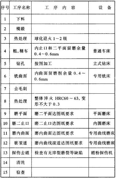 | 释义 | QJM型液压马达关键零件的工艺过程 (1)定子加工工艺过程 由于定子是由轴承钢整体淬火后加工成形的,所以,在编制工艺规程时,应特别注意以下几点: ❶ 定子的内圈是凹凸不平的内曲线,且壁厚相差很大,淬透不匀且淬火变形大。实践证明,GCr15SiMn要比GCr15淬火温度低,而且淬透性好。 ❷ 锻打后的球化退火要彻底。为了减少淬火时的内应力,球化退火必须达到一至二级,无网状组织。 ❸ 必须严格控制淬火温度及淬火油的含水量。 ❹ 必须保证曲线加工机床的精度。内曲线的加工,目前国内还停留在用凸轮靠模的水平上。要保证内曲线的平滑过渡,必须要保证机床主轴与凸轮靠模传动轴之间的精度,不允许有松动现象。因此,采用国外先进的内曲线加工中心是合宜的。 ❺ 注意内曲线精磨砂轮与钢球的尺寸配合。 为了保证定子的内曲线达到设计要求,在精磨内曲线时,应注意砂轮的直径与该马达装配用的钢球直径尽量保持一致。因为,砂轮的直径大小,直接影响到内曲线的形状。 定子的工艺路线见表37.6-1。 表37.6-1 定子工艺过程表