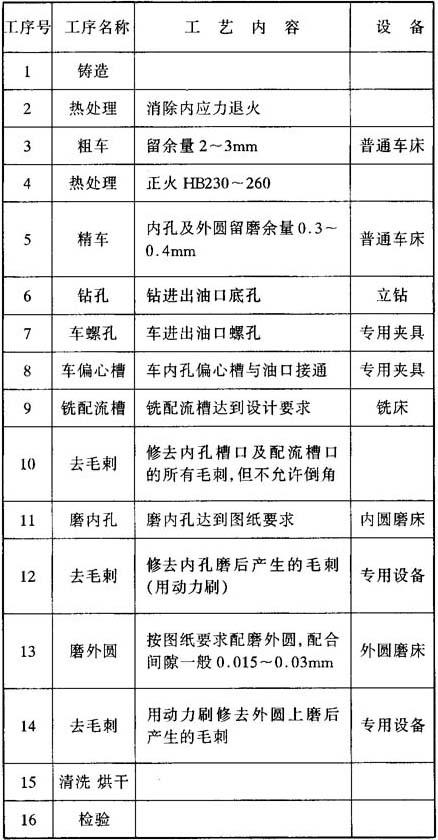 (3)配流轴加工工艺过程 配流轴的加工,应注意以下几个问题: ·配流槽与定位孔及配流槽之间的角度等分。在用夹具加工时,应注意夹具本身的分度精度。在可能的情况下,最好能在加工中心或数控铣床上用计算机控制分度。 ·与转子的配合间隙及形位公差必须达到设计要求,因此磨削加工工序应严格检测。 ·必须彻底清除配流轴的毛刺。 其工艺路线见表37.6-3。 表37.6-3 配流轴工艺过程表