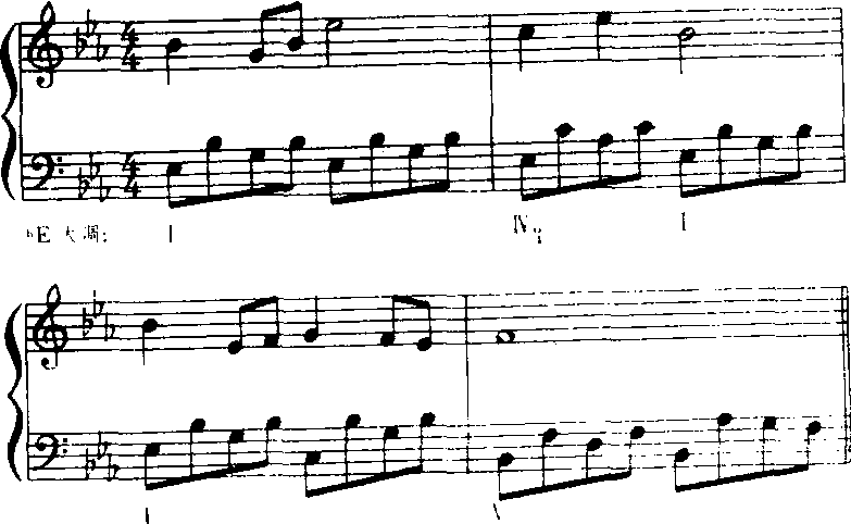但有时为了歌曲色彩、形象、情感等方面的对比与变化,也可以把主旋律放在低声部,由左手弹奏,而右手在高声部弹奏和弦节奏型。例《送别》(b)的另一个片断: