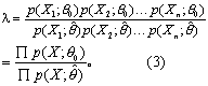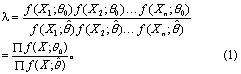| 释义 | 似然比检验 似然比检验似然比检验是一种寻求检验方法的一般法则。其基本思想如下: 设由n个观察值X1,X2,…,Xn组成的随机样本来自密度函数为f(X; θ)的总体,其中θ为未知参数。要检验的无效假设是H0: θ=θ0,备择假设是H1:θ≠θ0;检验水准为α。为此,求似然函数(见条目“极大似然法”)在θ=θ0处的值与在θ=θ(极大点)处的值(即极大值)之比,记作λ,