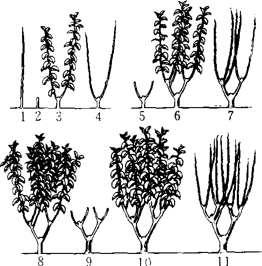 低干桑养成法 1. 栽植当时 2. 栽植后剪干 3. 当年生长情况 4. 第一年冬季 5. 第二年春伐 6. 第二年生长情况 7. 第二年冬季 8. 第三年春季生长情况 9. 第三年夏伐 10. 第三年秋季生长情况 11.第三年冬季 低干桑指树干高度(包括主干和支干)在65厘米以下的栽培型桑树。树形低,栽植密度大,收叶期早,单产高。大多数桑园采用这种形式。 |