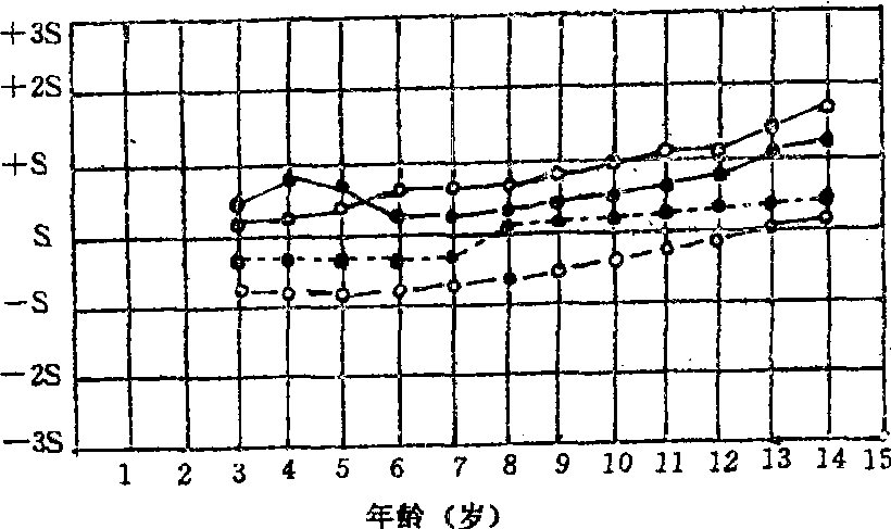 图1 7岁女学生体型图 用体型图也可对集体儿童的发育进行评价,即将该集体(按不同性别年龄分组)各项发育指标的实测均值作成体型图,与当地“标准”或其他集体儿童的体型图进行比较。 体型图的优点是能比较简便地评价每项指标的发育水平并评价出各发育指标之间的关系。主要缺点是不便于作连续性的追踪评价,同时各个指标的数据之间没有经过相关回归处理,因而不能确切地反映其中的关联和匀称程度,尤其是对各年龄组中较高和较矮的儿童,评价匀称程度时就更不易达到准确。 Fels针对体型图的上述缺点将该法作了修改,使对个体儿童进行发育评价时,既能综合评价多项发育指标,还能连续追踪观察其动态变化,经前后比较可看出该儿童的发育趋势,但这种Fels综合评价法(图2)和体型图同样只能较粗略地评价发育的匀称程度。