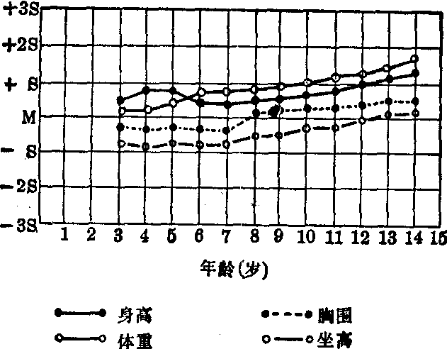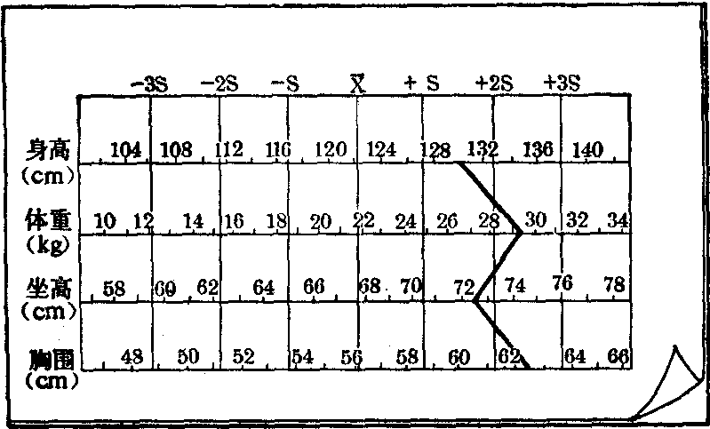 图1 某地女性7岁体型图 例如: 某7岁女童其个体发育资料与标准比较