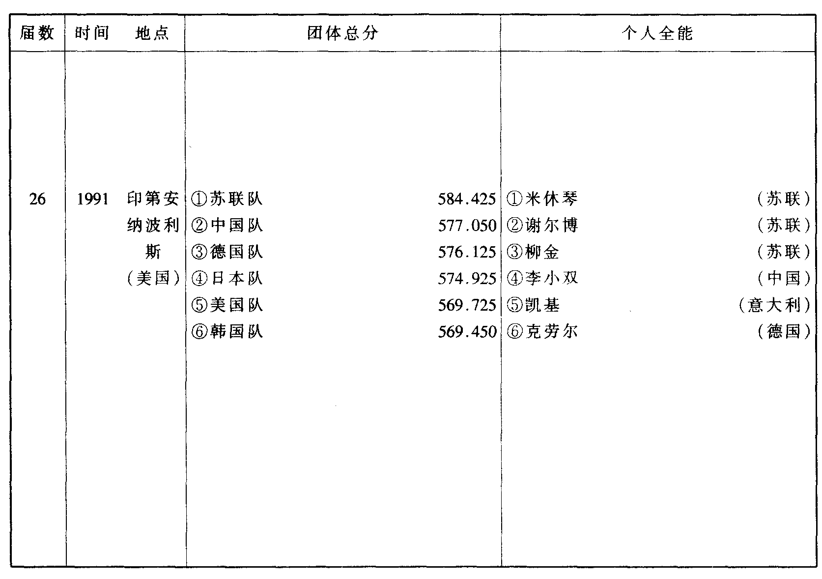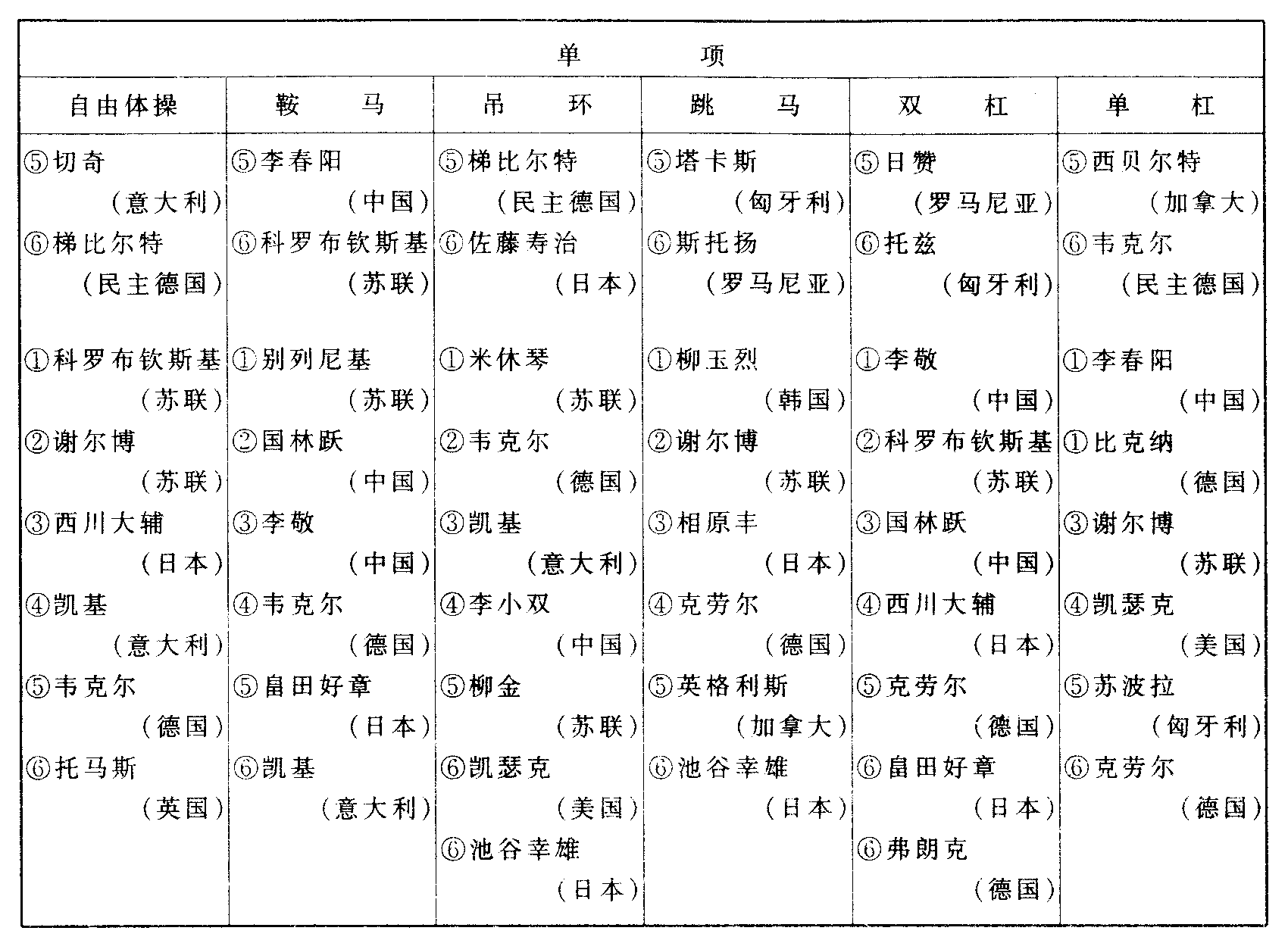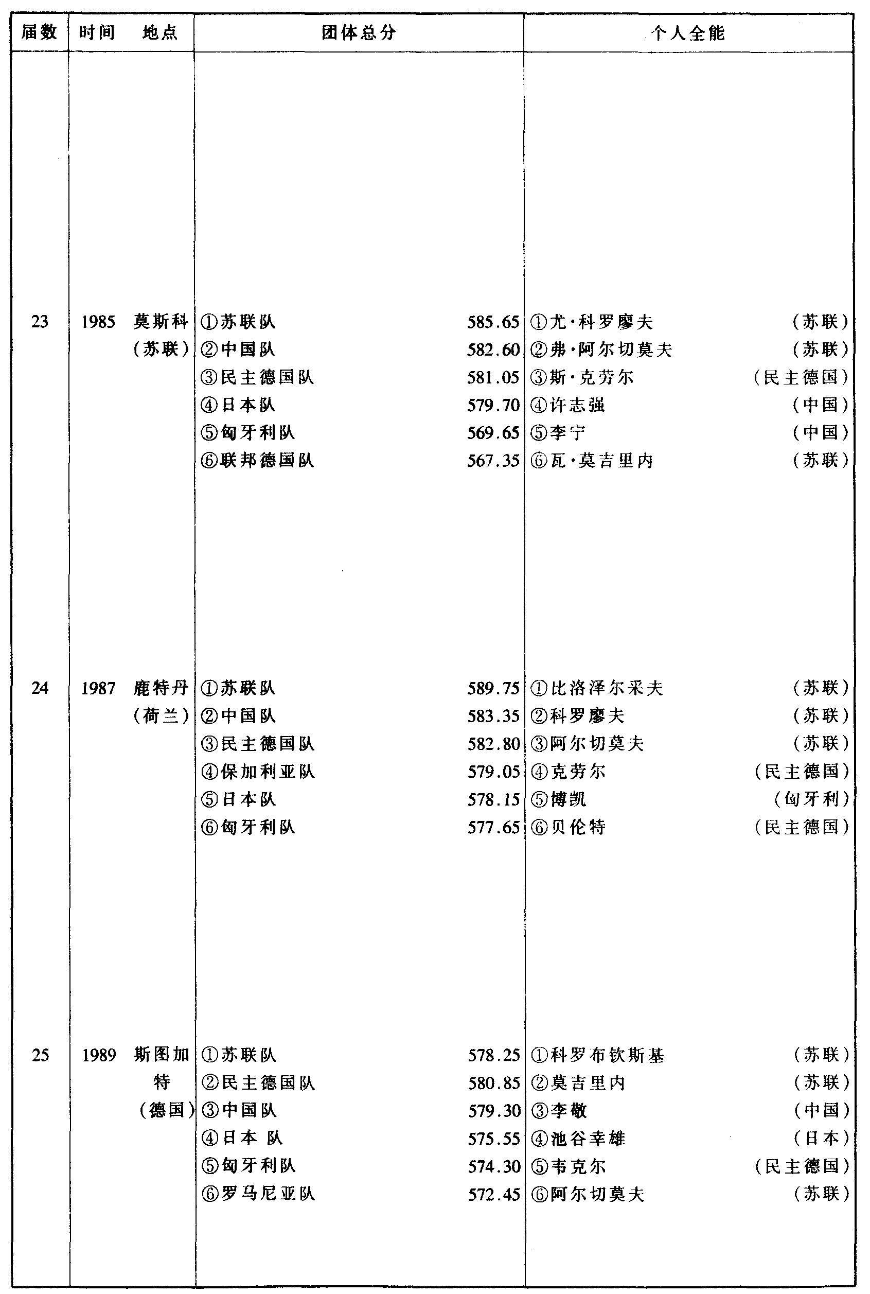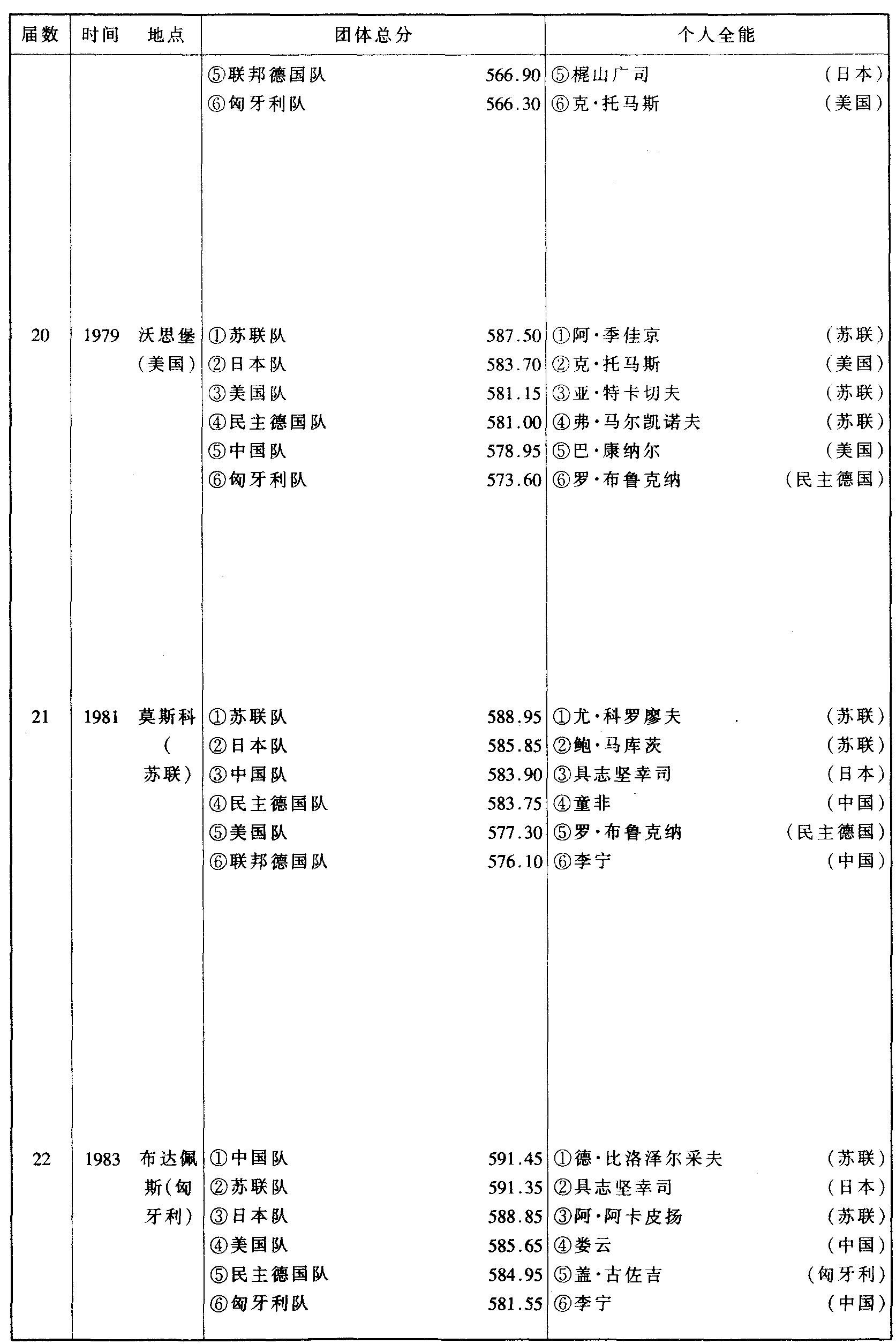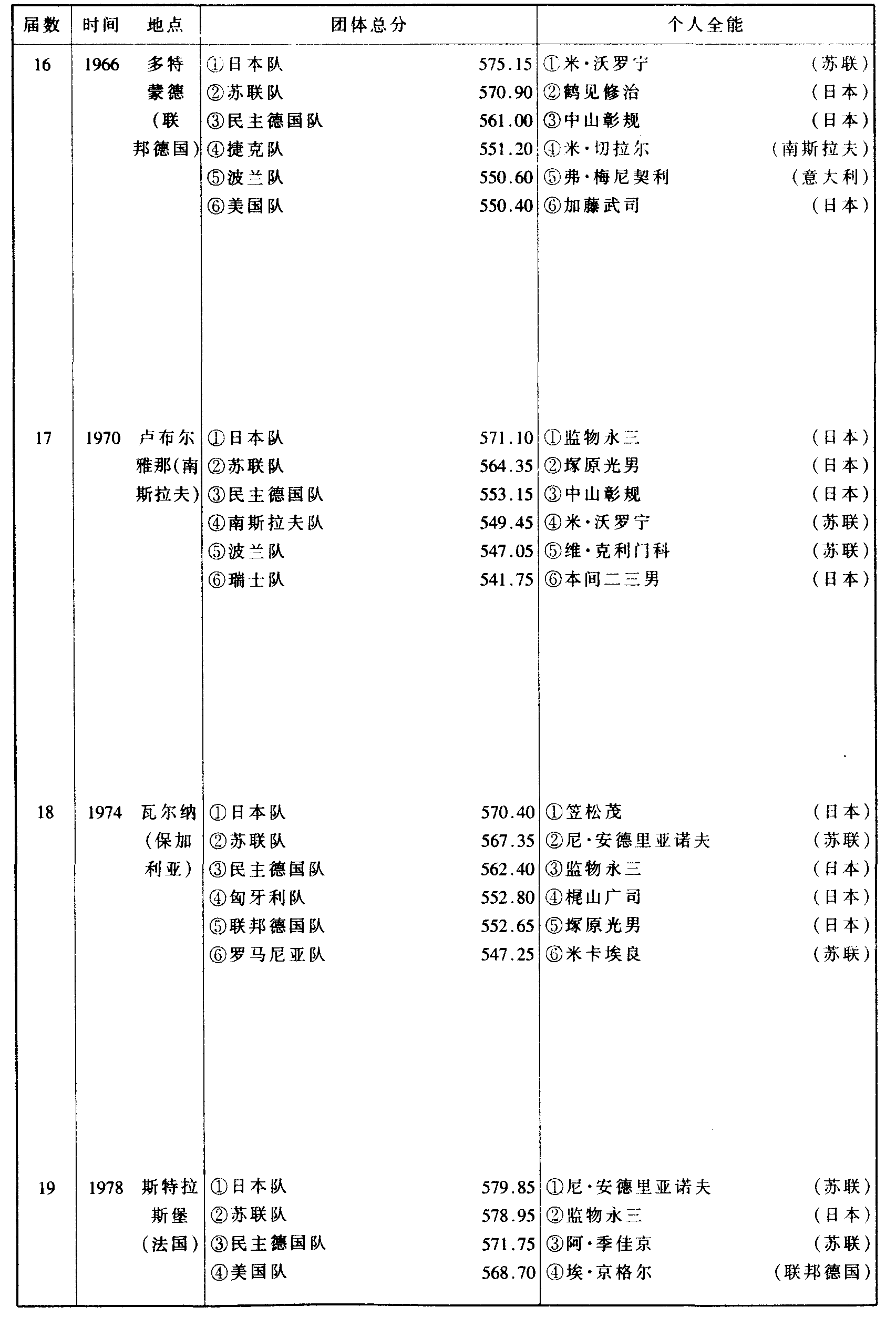 历届世界体操锦标赛比赛成绩