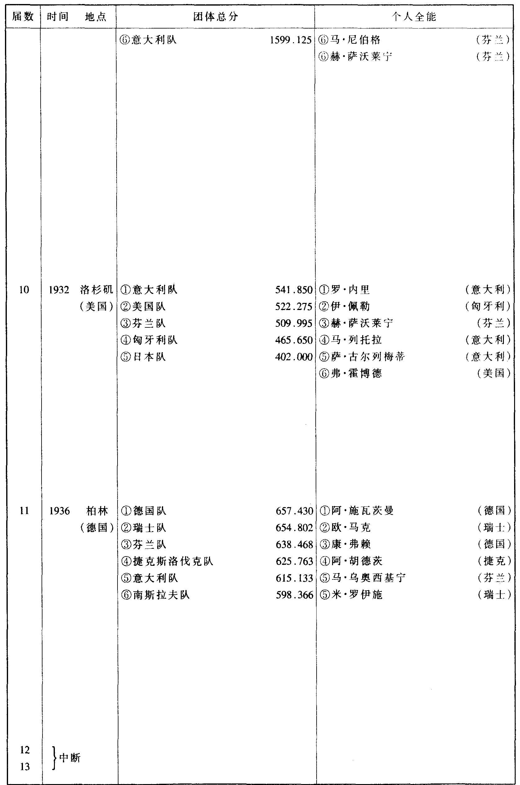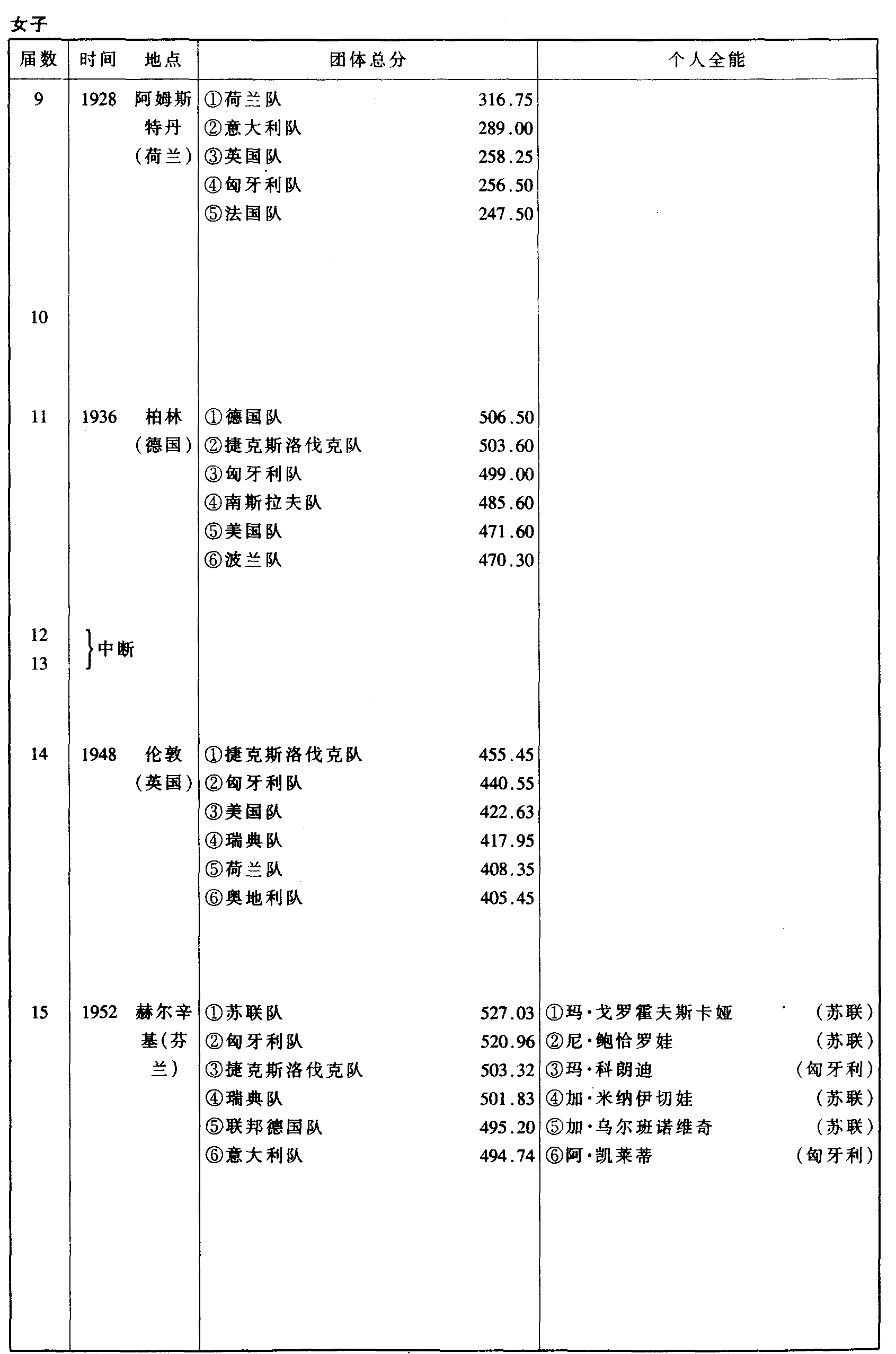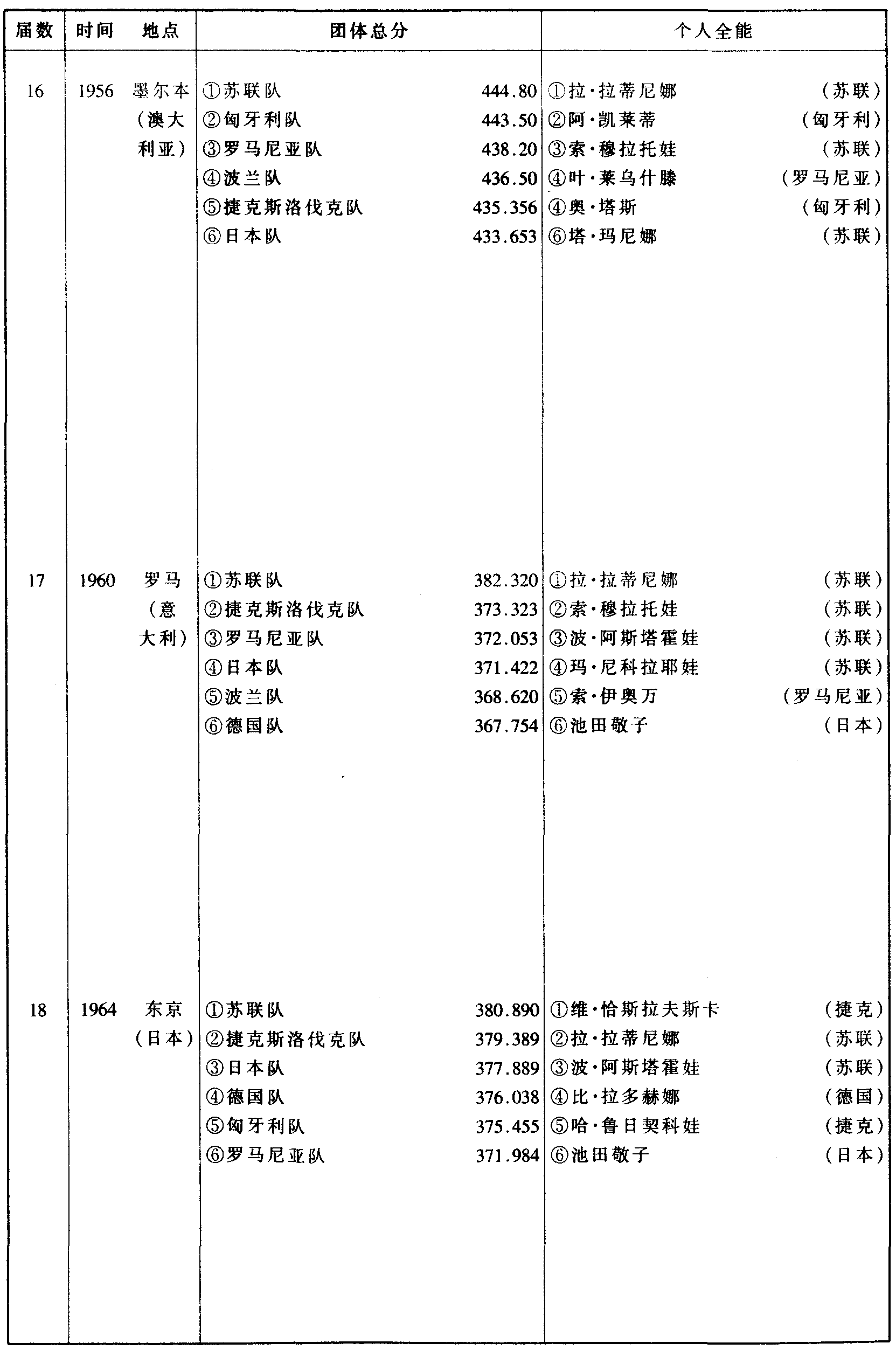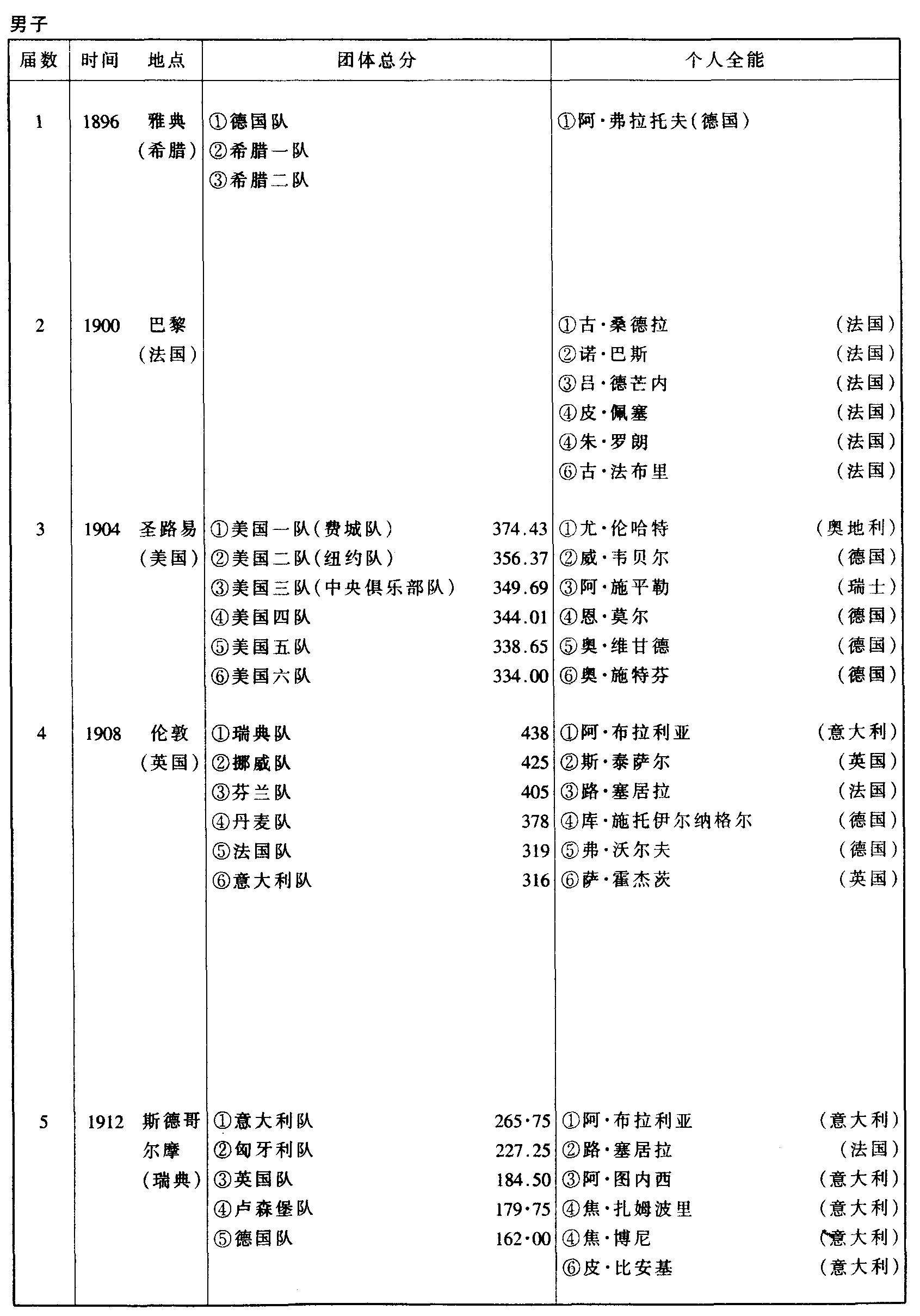 历届奥林匹克运动会体操比赛成绩