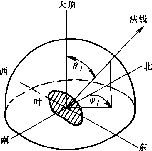 图 2 叶片法线方向的表示方法 作物器官的空间配置函数 主要是叶片空间配置函数, 即指作物株间高度Z的某一厚度层中, 叶片法线方向的单位立体角内叶面积同整个上半球空间内总叶面积的比率。它反映叶片在空间的排列状况, 故又称叶片的空间排列函数。对此苏联学者Ю.К.罗斯等人曾以叶片法线 (即从叶片背面指向正面的垂线) 的两个角度——叶片倾角θ1和方位角1, 来表示叶片在空间的位置。图2所示: ❶叶片倾角θ1 是用叶面的法线和天顶的夹角来表示, 也可用叶片伸展方向和水平面的夹角来代替。例如,水平朝上的叶片,其法线垂直向上,θ1=0°;直立叶片,θ1=90°。 ❷叶片方位角1, 用叶片法线在水平面上投影和子午线的夹角来表示 (从正北算起,按顺时针方向计算)。当叶面法线方向 (θ1, 1)确定后, 叶片在空间的位置也就确定了。例如, (π/2, π) 表示叶片法线为水平, 即朝正南的直立叶片; (0, π/2) 表示为水平叶片。在作物群体中, 叶片正面常向上, 叶面可以视为向着上半球, 其法线的空间是2π, θ1变化于0~π/2之间,而1变化于0~2π之间。在实际测定中, 一般对作物层取10~20厘米厚度为一层; 叶片倾角从0°开始, 每15°为一个取值区间,依次编为j=1, 2, ……6组; 叶方位角从正北 (作为0°)开始, 每45°为一个取值区间, 依次编为k=1, 2,……8组。于是对每一水平层而言整个上半球就分成j×k个空间,即要测定j×k个叶面积。因此, 叶片空间排列函数为: