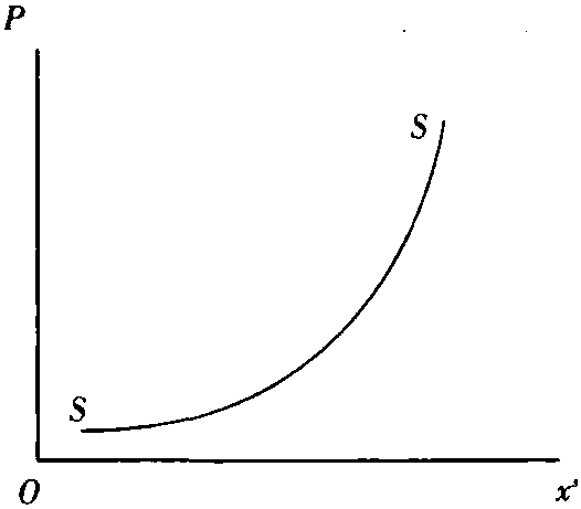〖参〗供给函数 ☚ 供给函数 供给价格弹性 ☛ 供给曲线 供给曲线supply curve表示某一特定时间内,当某商品的生产成本、技术水平、相关产品价格、厂商对某商品价格预期不变时,在此商品不同价格水平下,厂商愿意和能够提供的商品数量与相应价格之间关系的曲线,称为供给曲线。 在完全竞争市场上,厂商的短期供给曲线是位于平均可变成本最低点以上的那一部分边际成本曲线。它是一条向右上方倾斜的曲线,表明产品价格越高,厂商愿意出售的产品数量越多。市场或行业的短期供给曲线是本行业所有厂商的供给曲线的总和。 在完全竞争市场上,完全竞争厂商的市场长期供给曲线有三种不同情况: ❶水平的供给曲线,它表示由于厂商的进入和退出而增加或减少产量时,整个行业的成本不随产量而变化; ❷斜率为正的供给曲线,它表示由于厂商的进入或退出而增加或减少产量时,整个行业的成本随产量的增加而增加; ❸斜率为负的供给曲线,它表示由于厂商的进入或退出而增加或减少产量时,整个行业的成本随产量的增加而减少。 与完全竞争市场不同,垄断竞争市场、寡头市场、垄断市场均不存在供给曲线。 ☚ 市场需求函数 供给的变化和供给量的变化 ☛ 供给曲线 供给曲线反映商品的价格与供给量之间关系的坐标曲线。西方经济学中市场均衡理论的一个基本概念。由英国经济学家马歇尔提出。其一般表示式是: y=f (x) 式中,y代表供给,x代表商品价格,f为函数符号,表明供给量y是价格的正比例函数。根据市场均衡理论,在其他条件不变的情况下,当某一商品的价格上升、利润增大时,会吸引更多的企业生产该种产品,使供给量增加。反之,当价格跌落时,会因利润少而缩小生产规模,甚至停产、转产,供应量随之减少。这种关系表示为坐标上的曲线如图示: