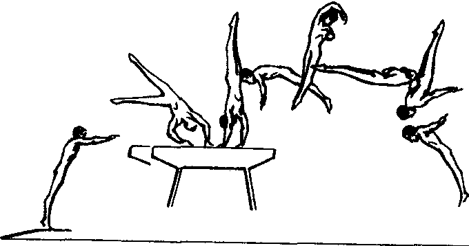 | 释义 | 侧手翻内转90°直体后空翻转体360° 侧手翻内转90°直体后空翻转体360°男子支撑跳跃高难度动作之一,推手形成的支撑反作用力,通过人体总重心的后方,使身体产生同向转动进入腾空,属复合多轴型动作。1978年第19届世界体操锦标赛上,前苏联女选手涅利·金曾以它力挫群芳,再次登上女子跳马世界冠军的宝座。此后,前苏联沙波什尼柯娃、美国弗雷德里克、保加利亚斯托加诺娃以及美国雷顿都分别以它夺得1980~1984年历届世界大赛的金奖,成为红极一时的动作。运动形态特征是:跳转180°经手倒立推起,空中做直体后空翻转体360°。技术要点:含胸起跳后,上体侧转下压,两臂伸向器械,同时腰部侧吊带动下肢完成转体上至倒立部位(稍有背弓),紧接回腿上顶并突然制动。推离后,两臂顺势摆起向上梗头立腰,当人体刚开始按横轴翻转时,两臂胸前抱拢(右臂左旋带动头部左转),此时配合向上兜髋并绷紧身体进入连翻带转的复合运动,当翻转成俯势时,立即两臂侧伸,梗头立腰抬起上体,随后挺胸出髋,两腿后伸准备落地。当练习者熟练地掌握侧手翻内转90°团身后空翻转体360°的技术后,可在助力下练习接直体后空翻。保护者位于马前侧高位上,推离后抄托臀部助其直体翻转。随着动作熟练,则通过逐渐加高落点垫子,进一步要求直体翻转的速度(开始可加助力)。当能较自如地独立完成动作时,则将马放置在海绵坑边进行练习,接做直体后空翻转体360°的完整动作。