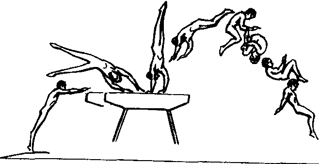 支撑跳跃中难度动作之一。推手形成的支撑反作用力,通过人体总重心的后方,使身体产生同向转动进入腾空。属手翻空翻复合型动作。运动形态特征是:侧手翻推离同时向外转体90°,空中以团身姿势向前空翻一周。技术要点:起跳后,上体侧转下压,两臂前伸撑向器械的瞬间,立即腰侧发力带动下肢上摆,当上至倒立部位时,用力推离。紧接左肩后翻,头部左转向外转体,与此同时迅速梗头、立腰起上体。当面部转向正前方时立即向前下梗头、提腰、翻臀、屈膝抱腿(足跟紧贴臀部)加速向前翻转。当人体在空中刚进入仰势时,立即两臂上举同时向前伸腿,随后向上梗头出胸,紧髋准备落地。当练习者掌握原地前空翻和跳马侧手翻外转的技术后,可在马前放置高垫(垫高同马),在助力下进行侧手翻外转90°接前空翻成高垫上仰卧的练习。保护者位于马前侧高位上,练习时抄托背部助其翻转。随着技术熟练,可适当降低落点高度,在助力下完成接做前空翻动作。当大体掌握后,可抽掉高垫独立进行练习。根据情况,也可采用海绵坑进行练习。