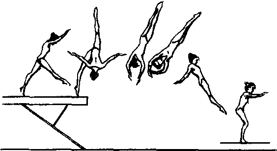 动作要求:蹬木、摆腿有力,腾空高转体正,落地稳定。 初练时,首先掌握侧空翻转体90°,然后在帮助下做转体270°下。 帮助者立于练习者侧面的保护台上,一手扶腹部上托,另一手扶腰“搓”转,帮助快速转体,落地时扶其腰腹部,帮助稳定着地。 ☚ 侧空翻转体90°下 团身侧空翻两周转体90°下 ☛ |