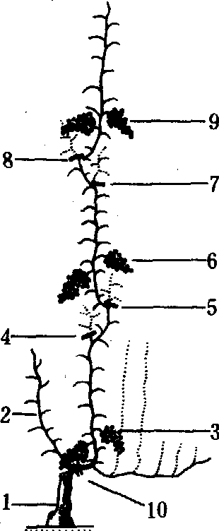 暖地葡萄修剪示意图 1. 主干; 2. 预备枝;3.第一次结果;4.第 一次摘心; 5.第一次 修剪;6. 第二次结果;7. 第二次摘心; 8. 二次修剪;9. 第三次结果; 10.冬季修剪部位 |