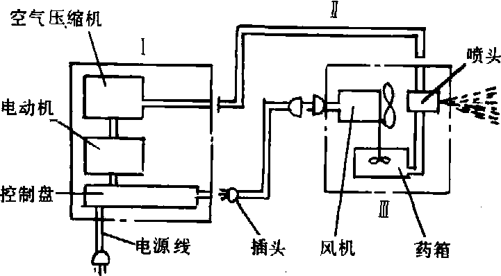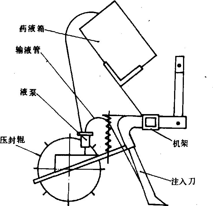 图 1 注入刀式土壤消毒机构示意图 与10马力拖拉机配套,一次作业四行时,生产效率为3~4.5亩/小时。注入棒式土壤消毒机由注入棒、曲柄、药箱、液泵、压封辊等组成。利用曲柄机构使注入棒上下运转,以点状形式向土壤注入药液。旋转爪式土壤消毒机是在旋耕机上安装药液注入管,在耕地同时注入药液。植物保护机械 温室和塑料大棚内常用的植物保护机械有: ❶手动喷雾器。由药液箱、空气室、液泵、喷杆、喷头和手压杆等组成。工作时,将喷雾器背在身后,压动手压杆,使泵对药液加压而喷雾。 ❷机动喷雾机。如担架式喷雾机,由发动机、液泵、空气室、流量控制阀、混药器、喷头等组成。发动机带动工作部件喷射药液。机器由人抬着移动。工作原理和手动喷雾器基本相同。 ❸弥雾机。利用高速气流将药液吹碎成细小的雾滴并送向喷射作物。由动力机、弥雾喷头、喷管、输液管、风机、药箱等组成。作业时,动力机驱动风机高速旋转,产生高速气流,大量气流由风机出口经喷管到弥雾喷头吹出; 少量气流经进风阀到达药箱内药液上部的空间,对药液面增压,药液在风压的作用下,经输液管到弥雾喷头喷出。喷出的粗液滴被强大的气流冲击,弥散成细小雾滴吹向作物。 ❹常温烟雾机,由烟雾机和空气压缩机两大部分组成(图2)。压缩空气首先进入喷头体中的共鸣腔,产生