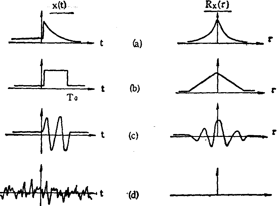 自相关函数的特性 ❶对于一般的非周期信号,Rx(τ)随τ的加大而减小。信号上相隔时间愈近的两点,取值的关联程度愈大;相隔时间愈远的两点,取值的关联程度愈小[图2(a)、(b)]。随机性愈强的信号,不同时刻取值的关联程度愈小,其Rx(τ)随τ增加而下降得愈快。若信号的自相关函数Rx(τ)只在τ=0时有值,而在τ≠0时恒等于零,则此信号称为白噪声〔图2(d)〕。白噪声在任意两个时刻的取值总是不相关的,其随机性最强; ❷周期性信号的自相关函数也具有周期性,其周期与信号的周期相等〔图2(c)〕; ❸自相关函数的富氏变换是信号的功率谱(参见“信号的谱分析”条)。