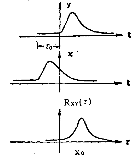 互相关技术可用来估计两个相似信号间的延迟时间,设y(t)是x(t)的延迟,则将y(t)左移至Rxy(τ0)达到极大时的τ0为两信号间的延迟时间(见图1)。例如,从微血管的显微电视图象中测量红细胞运动速度时,可在电视图象上沿血管的上游和下游各设置一个窗口,取出各窗口内的光密度信号,再求这两个信号间的互相关函数,由相关函数极大值所对应的延迟τ0和两窗口间的距离d0,可求得红细胞的运动速度。