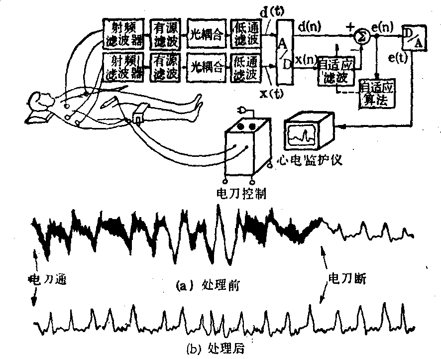 图1 一种自适应处理系统方框图 自适应处理在抑制高频电刀对心电监护的干扰中的应用,如图2所示。外科手术刀是利用高频电流工作的,因而会严重干扰心电监护中的心电图记录,对此可采用如图2(a)所示的自适应噪声抵消法。输入d(t)取自一般
