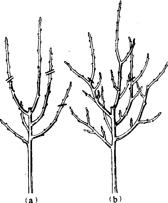 图 1 短 截 短截 剪去枝条的一部分(图1)。枝条经短截后,可以增强剪口芽的生长势。轻短截对原枝条的刺激较小,剪口芽不会发生强旺枝, 但下部芽受抑较轻, 萌发较多。一般在培养中小型枝组, 或希望减缓生长势时采用; 中短截的剪口芽为饱满芽, 能促发长枝, 和少量中短枝, 一般对骨干枝的延长枝, 中、大型枝组的带头枝, 以及希望填补空间时采用; 重短截常能促发几个旺枝或徒长枝, 使局部生长势得以加强, 这种效应与增施氮肥相似。因此, 仅在控制枝组或平衡树势时采用。重短截虽然能促生强旺枝, 但由于被剪去的枝段也较长, 树冠相对被缩小, 枝条中贮存的营养也有所损失, 所以对植株的整体是一种削弱。对幼树和壮树重短截愈多, 对剪口芽的促进愈明显, 但对全树总生长量、总叶量则愈减少。对整个树势的削弱也明显; 对老弱树适当重剪, 则由于增加了根/冠比,使贮藏营养集中使用,反可以促进新梢萌发, 树势复壮。 疏剪 又称疏枝, 是把一年生枝或多年生枝从其基部剪除。疏除上部枝条, 其顶端优势就转移到下部的枝条, 增强生长势; 如疏除的枝条处于下部, 疏除时的伤口对其上部的枝条, 则是一种损伤和阻力, 对上部的枝势起减缓作用。疏除强枝可以减少竞争、缓和生长与结实的矛盾, 疏除弱枝,则可以集中营养,有助于留存枝、芽的复壮更新和提高成花坐果能力。疏剪也用在减少一树的枝量, 或使枝叶过密部分改善风光条件, 而不致影响对局部的重大刺激。 长放 又称甩放、缓放。即放任枝条自然生长。长放的枝条顶端, 生长势逐年削弱。分枝多而短, 有利于缓和树势, 增加积累, 促进成花。幼旺树, 适当甩放一部分拉平的长枝、壮枝,有利于提早成花结实。直立枝长放, 则由于叶面积多, 顶端优势强, 反而会促使枝茎加粗快, 生长继续过旺, 故长放应结合拉枝。缩剪 又称回缩(图2)。常用于骨干枝的换头或结果枝组的更新。缩剪的反应与剪截口大小, 剪截量的多少和截留枝芽的质量有关, 缩剪旺枝, 对剪口刺激重, 应在剪口留有一定量的发育枝,以分散其势力, 达到缓和的目的, 一般用于层间大的辅养枝上; 缩剪弱枝, 则对后部有良好的复壮作用, 通常用于衰弱的结果枝组。 ![]() 图 2 缩 剪1. 轻缩剪; 2. 中缩剪 刻伤 又称目伤。在枝条萌芽前,于芽的上方约2~3. 重缩剪3毫米处,横刻一刀, 深及木质部, 由于伤口刺激和养分截留, 可以迫使该芽萌发, 在希望补空时使用。在芽上涂BA(苄腺嘌呤)发枝素, 也有类似的效应。