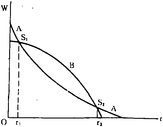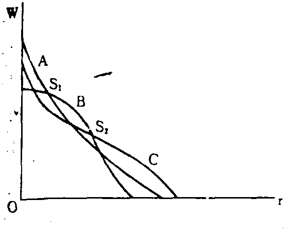 图1 图2描述了无再转辙时的倒转资本加深。在这里,在社会最优技术选择的外边界线上,任意两条工资—利润线之间都只有一个交点,这意味着没有再转辙,然而在s2点却发生了倒转的资本加深,这是因为就B与C两种技术而言,C的人均资本量大于B的,所以C代替B便显示了人均资本量与利润率之间的反常关系。