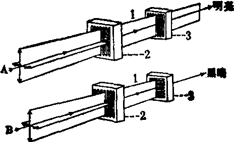 图1 双折射体与光的偏振 普通光线进入双折射体时,分为A、B两种平面的偏振光,二者的振动方向互相垂直
