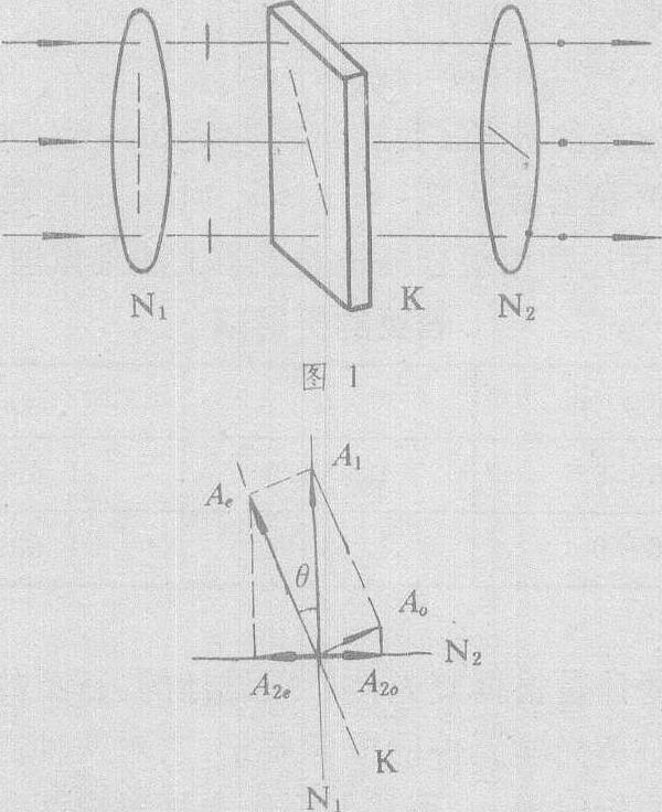 | 释义 | 偏振光的干涉 偏振光的干涉pianzhenguang de ganshe从双折射晶体出射的两束线偏振光之间的干涉。可分为平面偏振光的干涉和会聚偏振光的干涉。1811年,阿喇戈通过方解石观察从云母片出射的光,发现互为补色的现象,这种色偏振现象是偏振光干涉产生的。平面偏振光干涉的装置如图1所示,N1和N2为线偏振器,K为光轴平行于表面的波片。平面自然光自左向右入射到N1上,在N2后面的屏幕上可看到干涉图样。在图2中,N1和N2分别代表起偏器N1和检偏器N2的透振方向,当两个偏振器的透振方向互相垂直时,这种系统称正交系统。K为波片的光轴方向。设通过N1后的线偏振光的振幅为A1。线偏振光在波片前表面分解为o光和e光,振幅分别为Ao和Ae。o光和e光通过厚度为d的波片后,它们之间的位相差为 δk=2πd(no—ne)/λ 式中λ为光的波长,no和ne为波片的主折射率。于是,从波片出射的两束线偏振光,它们的频率相同,有恒定的位相差,传播方向也相同,但是振动方向互相垂直。两束光从偏振器N2出射时,光振动方向也相同了,分别为它们沿着透振方向的分振动,可产生干涉。这两个分振动的振幅分别为