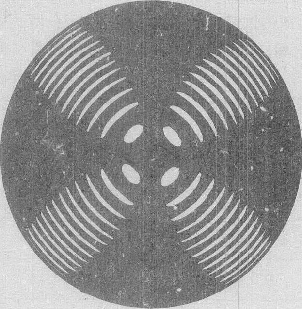 图 3 会聚偏振光干涉的装置如图3所示。K为光轴垂直于表面的晶片。透镜L1将平面偏振光变为会聚偏振光,射到晶片上,透镜L2则将从晶片出射的光,再变为平行光。干涉图样呈现在N2之后的屏幕上,以相同入射角入射到晶片的光线交于屏幕上同一半径的圆周。光线在晶片内分解成o光和e光,从晶片出射时两束光之间有位相差,而位相差与入射角有关。因而干涉条纹为明暗相间的同心圆环。若用白光入射,可看到彩色的同心环,同一圆周为同一色,所以称这种干涉条纹为等色线。图4为会聚光干涉的干涉图样,图中除明暗相间的圆环——等色线外,还有黑十字刷。若光线在N1的透振方向和K的光轴构成的平面内,或在过光轴目与上述平面垂直的平面内,那么从N1出射的线偏振光,它的光振动方向沿着N1的透振方向,相当于晶片内的e光或o光,从晶片出射时,仍为原振动方向的线偏振光。当N2与N1正交时,这些光线不能通过N2,这就是黑十字刷出现的原因。当N2与N1平行时,将呈现亮十字刷。如果晶体的光轴为其它取向,所得的干涉图样将十分复杂。