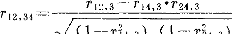 式中y123表示剔除了第3个变量影响之后的第1、2个变量之间的相关;r12、r13、r23表示下标的那2个变量的相关。至于谁是第1变量、第2变量或第3变量,则可视实际情况而变化。 类似地,在剔除了第3、第4个变量影响之后的偏相关系数计算公式为: