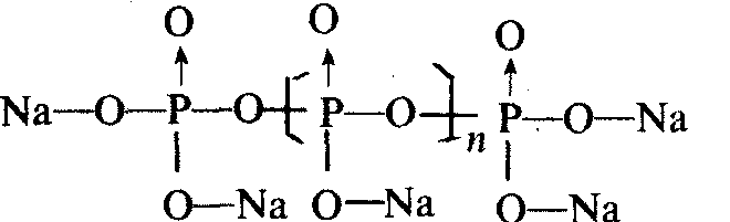 通式为(MPO3)n,一般是聚集成环状的化合物,常见的有二聚体 (六元环) 、四聚体 (八元环) 、多聚体等。多聚体不具备确定的晶体结构,又称磷酸盐玻璃体。最常见的偏磷酸盐玻璃体是格式盐,俗称六偏磷酸钠,这实际是误称,可表示为(NaPO3)n ,n值为20~100,结构为: