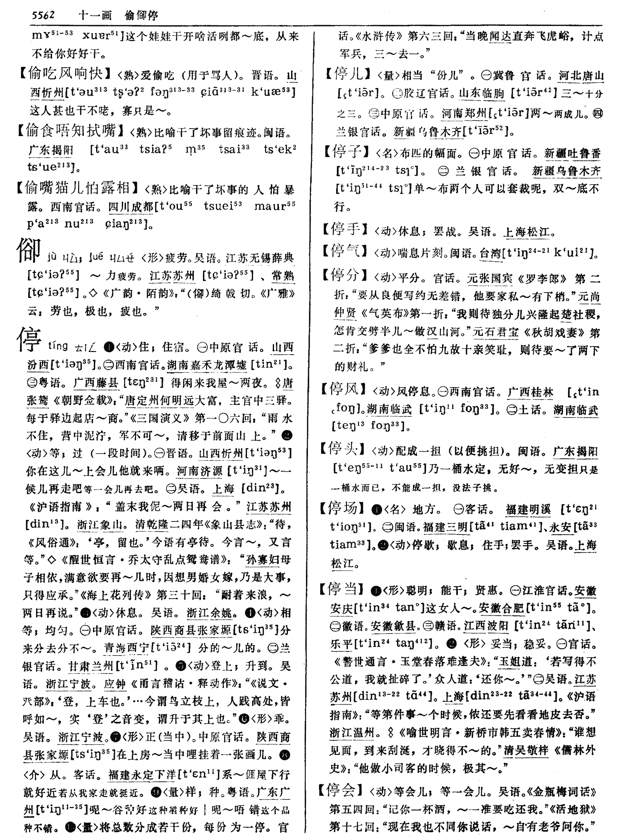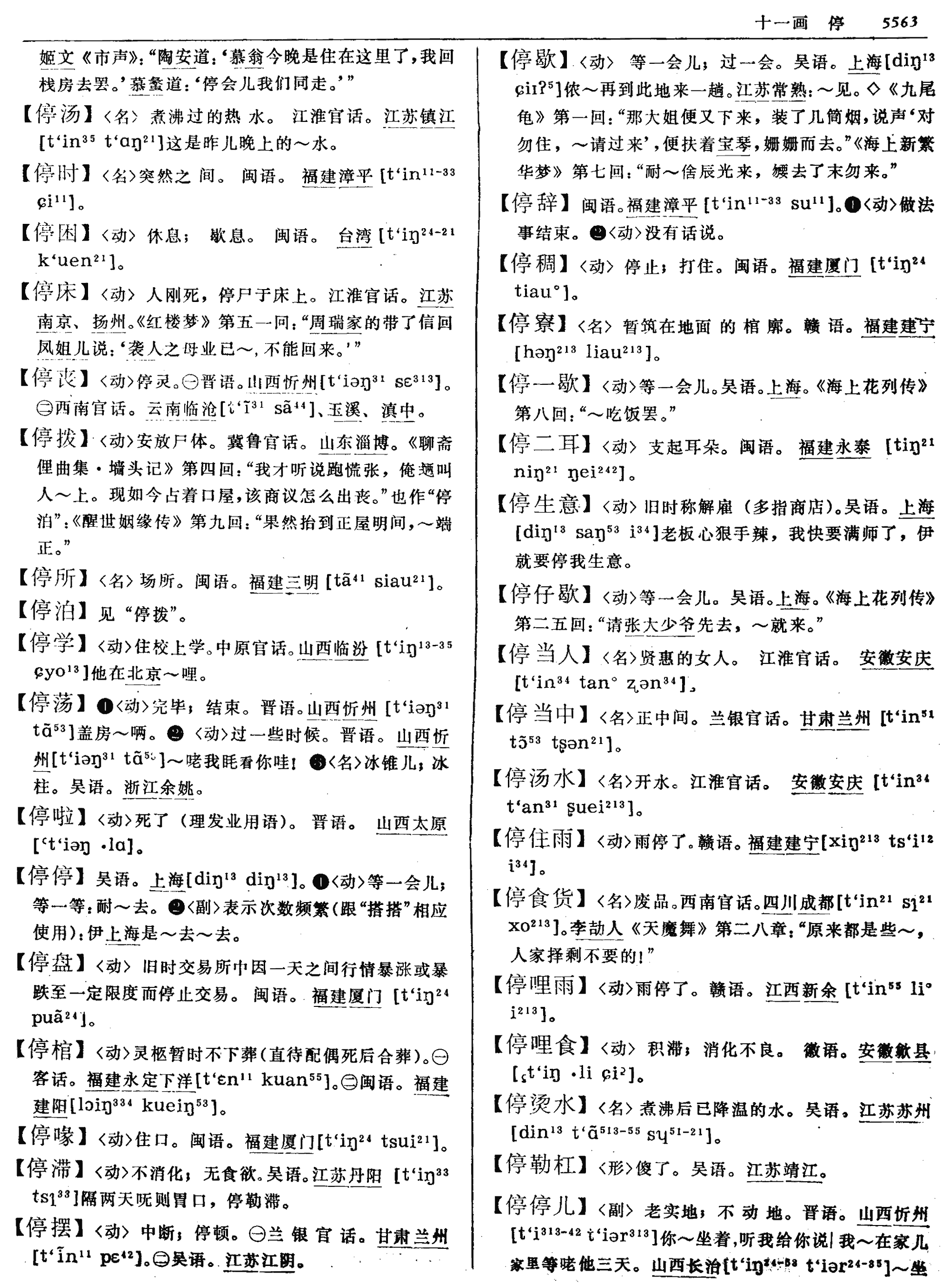 停tíng❶不前,滯留。班固《終南山賦》:“流澤遂而成水,停積結而爲山。”朱穆《鬱金賦》:“美鬱金之純偉,獨彌日而久停。” ❷中斷,停頓。禰衡《鸚鵡賦》序:“筆不停綴,文不加點。” ❸通“婷”。見下。 ❹定。禰衡《鸚鵡賦》:“且其容止閑暇,守植安停。” 停tínɡ平、匀,不作“三成五成”的“成”讲。《杀狗劝夫》剧一:“若不是死了俺娘亲和父亲,这家私和你匹半~分。”匹半,即劈半。停分,即平分。《秋胡戏妻》剧二:“(正旦唱)则待要~分了两下财礼。”上文梅英父罗大户白:“我待要和你婆儿平分财礼钱哩。”《后庭花》剧一:“若有那拿粗挟细踏狗尾的但风闻,这东西一半儿~将一半儿分。”义并同。 停 《释名》:“停,定也,定于所在也。”《庄子·德充符》:“平者,水停之盛也。”停,滞留。 1.通“竚” zhu 〔例〕 《三国志·吴书·华覈传》:“又敕作草文,停立待之。”停立,久久站立。停通“竚”。 停,定母、耕部;竚,定母、鱼部。定母双声,耕、鱼旁对转迭韵,属音近通假。 2.通“亭” ting 〔例一〕 《水经注·江水》:“自三峡七百里中,两岸连山,略无阙处,重岩叠嶂,隐天蔽日,自非停午夜分,不见曦月。”停午,正午,停通“亭”。 〔例二〕 梁刘孝绰《谢给药啓》:“一物之微,遂留停育。”朱起凤《辞通》云:“停、亭同音借用。”停育,化育。停通“亭”。 停,定母、耕部;亭,定母、耕部。定母双声,耕部迭韵,属双声迭韵通假。 停 停tíng(1)总数分成几份,其中一份叫做一停。李从周《抛球乐》:“冷地思量着,春色三停早二停。”(4—2403)刘壎《贺新郎·催花呈赵云舍》:“韶色三停今过一,只淡黄杨柳装愁思。”(5—3336) (2)陈列。晏几道《庆春时》:“雕鞍游罢,何处还有心期。浓熏翠被,深停画烛,人约月西时。”(1—257) ☚ 亭堠 停匀 ☛ 停读音t·ing(ˊ),为ing韵目,属ing—eng韵部。特丁切,平,青韵。 ❶停止。 ❷停留。 ❸停泊;停放。 上一条: 亭 下一条: 渟 停1. 均等。俗语:“二八月昼夜相停。” 《西北花儿精选·你看把你咋想来》:“一进城门楼子街,五寸刀子怀里揣,心肺肝花停剁开,你看把你咋想来?!”2. 总数分成几份,其中一份叫一停。《郭巨埋儿》(贤孝):“一停的沙子二停的糠,七停儿老米择周全。”3. 埋葬前暂时把尸体停放在某处。《团圆宝卷》:“有亲戚朋友们给宋玉峰穿好衣服,支了床板停好。转眼日落西山,金郎在灵前供上灵牌,烧纸化钱一毕。” 停tíng葬前死者遗体的安放。〔例〕凤姐停了十余天,送了殡。 (红1325)∣没下葬呢,就在后堂停着呢。(儿289)∣“停几天呢?天佑太太!”天佑太太很愿意丈夫的丧事办得像个样子。(文五398) 停t‘iŋ24❶止息、停留: 时间暂停。《释名·释言语》: “停,定也,定于所在地也。” 《文韵》: “停,息也,定也,止也。” 李白《将进酒》: “将进酒,君莫停。” ❷中断,暂时停止: 停车,停水,停电。白居易《山路偶兴》 诗: “提笼复携榼,遇胜时停泊。” ❸等分,一分叫一停儿,等分叫停: 路刚走三~。《红楼梦》 第六十八回: “彼时大观园里十停人倒有九停人知道了。”此义引申公平分派: 把东西~分了。 停〔ting〕 1. zos: 一只蜻蜓~在篱笆上。ad ngongl badzheal zos nib zheud cheid.2.bas: 雨~了。bas nongsjul. 停当 〔ting dang〕 janx: 这件事办~了。ad gians sib nendchud janx jul. 停顿 〔ting dun〕 jid del:说到此~一会儿。pud dandnend jid del ad roul deb. 停工 〔ting gong〕 jangt nius. 停留 〔ting liu〕 xaot zhol: 他在这里~了三天。wud nibnend xaot zhol bub hneb. 停息 〔ting xi〕 bas: 雨~了。bas nongs jul. 停歇 〔ting xie〕 xaot. 停止 〔ting zhi〕 jid del: ~活路休息一会。jid del gouddongb xaot ad roul deb. 停{}四5562①动住;住宿。⑴中原官话。山西汾西〖 〗。⑵西南官话。湖南嘉禾龙潭墟〖 〗。⑶粤语。广西藤县〖 〗。得闲来我屋~两夜。◈ 唐张𬸦《朝野佥载》:「唐定州何明远大富,主官中三驿。每于驿边起店~商。」《三国演义》第一〇六回:「雨水不住,营中泥泞,军不可~,请移于前面山上。」②动等;过(一段时间)。⑴晋语。山西忻州〖 〗。你在这儿~上会儿他就来唡。河南济源〖 〗。~一候儿再走吧等一会儿再去吧。⑵吴语。上海〖 〗。《沪语指南》:「盖末我伲~两日再会。」江苏苏州〖 〗。浙江象山。清乾隆二四年《象山县志》:「待,《风俗通》:『亭,留也。』今语有亭待。今言~,又言等。」◇ 《醒世恒言・乔太守乱点鸳鸯谱》:「孙寡妇母子相依,满意欲要再~几时,因想男婚女嫁,乃是大事,只得应承。」《海上花列传》第三十回:「耐着来浪,~两日再说。」③动休息。吴语。浙江余姚。④动相等;均匀。⑴中原官话。陕西商县张家塬〖 〗。分来分去分不~。青海西宁〖 〗。分的~儿的。⑵兰银官话。甘肃兰州〖 〗。⑤动登上;升到。吴语。浙江宁波。应钟《甬言稽诂・释动作》:「《说文・癶部》:『登,上车也。』…今谓鸟立枝上,人践高处,皆呼如~,实『登』之音变,谓升于其上也。」⑥形乖。吴语。浙江宁波。⑦形正(当中)。中原官话。陕西商县张家塬〖 〗。在上房~当中哩挂着一张画儿。⑧介从。客话。福建永定下洋〖 〗。系~𠊎屋下行就好近若从我家走就挺近。⑨量样;种。粤语。广东广州〖 〗。呢~谷种好这种稻种好‖呢~唔错这个品种不错。⑩量将总数分成若干份,每份为一停。官话。《水浒传》第六三回:「当晚闻达直奔飞虎峪,计点军兵,
