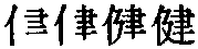 健jiàn❶强健。如:健康,健壮,健旺。 ❷使强健。如:健身,健胃,健美,健全。 ❸超过一般,善于。如:健谈,健忘,健步。 健jiànⅠ (强健) healthy;strong;well-set: 稳 ~ firm;steady;sane; 康 ~ healthy;in good health Ⅱ ❶ (使强健) strengthen;toughen;invigorate: ~脾 invigorate the function of the spleen;~ 胃 be good for the stomach ❷ (在某一方面显示的程度超过一般;善于) be strong in;be good at: ~ 谈 be a good talker Ⅲ (姓氏) a surname: ~ 武 Jian Wu ◆健步 walk with vigorous strides; 健步如飞 walk as if on wings;at a good bat;fleet [swift] of foot;walk fast and vigorously;walk with much bounce;with flying feet; 健儿 valiant fighter;good athlete;skilled athlete; 健将 master sportsman;top-notch player; 健康 health;healthy;physique;sound;fit; 健康产业 health industry; 健康检查 physical examination;check-up;health examination; 健康人格 health personality; 健美 strong and handsome;vigorous and graceful; 健美操 body-building exercises; 健美裤 vigorous and graceful trousers; 健美体操 callisthenics; 健脾益肺 strengthening spleen and tonifying lung; 健全 sound;sane;perfect;regular;integrity;perfect;improve;strengthen; 健身操 body building exercise; 健身房 gymnasium;gym;fitness centre; 健谈 be a good talker;be a brilliant conversationalist; 健忘 forgetful;having a bad memory;have a poor memory;amnesia; 健忘症 {医} amnesia; 健在 [书] (of a person of advanced age) be still living and in good health; 健壮 healthy and strong;anosia;robust 健jiàn❶ 健步如飞 健 金文; 篆jiàn[亻(人,意符)+ 建(聲符)→健(《説文》:“健,伉也。從人,建聲。”健,強壯,身體好〈健康、健全、康健、穩健、健美、健身、健旺、健在、健壯、健朗、保健〉; 善於,精力旺盛〈健步如飛、健談〉。)] [宋] 賀鑄《搗練子》:“馬上少年今健否? 過瓜時見雁南歸。”(當兵的青年還健在嗎? 退伍日期到了,怎麼不見青年只見雁南歸。) 健jiàn(10画)