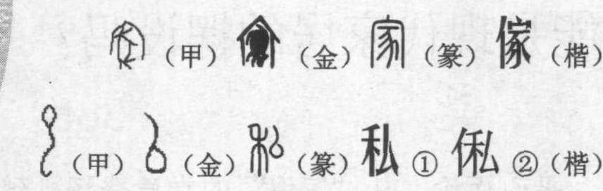 “傢”,来源于 “家”,是家的孳乳字。甲骨文的“家”,从宀,从豕,为象形字。“宀” 是房屋的标意,“豕” 是猪的标意,这头猪不是一般意义的猪,而刻意标示是一头公猪,猪肚下那条长长的生殖器鲜而易见。“家” 原来是由屋下卧着一头公猪而组构的。为什么要以公猪而组构 “家” 呢?这在本集开篇之作(自序)中已经有了交代。一言以蔽之,“家” 是父系的产物,又是父系的标志。 金文的“家”,更加形象。小篆的“家”为会意字。到楷书时,“家” 增加形符 “人” 又造出了个形声兼会意字 “傢”。上世纪五六十年代,汉字简化中 “傢” 又被简化为 “家”。 “傢” 在汉语组词中,仅见组有两个双音词: 一个是“傢伙”。“傢伙”即器具,多用于饮食器具,《儒林外史》十五: “马二先生……又尽力的吃了一餐,撤下傢伙去。” 《红楼梦》三五: “凤姐先忙着要干净傢伙来替宝玉拣菜。” 《水浒》二八: “武松把那镟酒来一饮而尽,把肉和面都吃尽了。那人收拾傢伙回去了。” 一个是 “傢具”。“傢具” 即家用器具,多用于农耕用具,《齐民要术·种槐柳楸梓梧柞》:“凡为傢具者,前件木皆所宜种。”无论是饮食器具的 “傢伙”,还是农耕用具的 “傢具”,它在被长期使用的过程中,大概由于它的作用所系,不知从什么时候开始,人们又赋予它以抽象的、拟人的象征意蕴。“傢伙”、“傢具”,在特定的语境下是男性生殖器的隐语,也是俗语,这在民间的乡村里弄、车间地头,至今不乏还有较高的使用频率。在用上 “傢伙”、“傢具” 的语境中,并非一律都是詈骂,而更多的又是语意深处的感叹、赞许和赞美,用以壮大语言的气氛和加重感染力度。这是远古时代男性生殖崇拜初期,对于男性生殖器的坚挺、壮大、神奇所作感叹在语言上的锁定,是生殖崇拜在语言上的孑遗。 金文的 “厶”,来源于甲骨文 “虫” 的形状,是甲骨文“虫” 的颠倒之形,为会意字。甲骨文的“虫”,很可能是精虫的象形描绘,这在本书第一集《巳子,精虫三千多年前已被发现? 》一节中有过述说,而至今仍然是个谜。就三千多年前人类认识自然的手段,是发现不了精虫的,然而事实就这样奇迹般地出现了,一尾精虫不是明明爬上了龟甲兽骨的刻面,摆在了我们的面前,已经是不可不承认的事实了。 “厶”,词书解释: 男女阴部。“厶” 是母系时期群婚制向偶婚制过渡时出现的概念。在这以前正如恩格斯在《家庭、私有制和国家的起源》中指出的 “……最古老、最原始的家庭形式是什么?那就是群婚,即整个一群男子与整个一群女子互为所有,很少有嫉妒余地的婚姻形式。” “厶” 其所以成为男女性器的标意符号,是因为在那时只有男女性器才是对方唯一能够占有的东西。随着“厶”的概念的形成,偶婚制也得到了巩固和发展。 “厶” 后来一般用作男性性器的标意符号,女性性器则用 “匕” 来标意。由于封建社会的确立,农业经济的长足发展,父系家庭私有制经济制度的进一步巩固,作为社会矛盾集中反映的是农业成果分配过程中的利益关系。到小篆时 “厶” 的原始之意被逐渐隐去,遂给“厶”增加能够反映社会实际的形符 “禾”,造出了一个形声会意字 “私”。(有关 “私” 的详细信息,请参阅本书第一集《公私,与许慎开了近两千年的玩笑》170—174页) 楷书❶的 “私”,是小篆的隶变。楷书 ❷的 “俬”,增加形符“人”,为形声会意字。“私” 的本意是男性生殖器,增加形符 “人” 是为了更加强化它男性生殖器的意寓。 任学礼先生说: “破译中国文字,离不开陕西话。”陕西关中人有句责骂人的话“耍傢俬”,如果说“傢伙”、“傢具” 在一定语境下其语意深处是对男性生殖器的感叹、赞许和赞美,那么 “傢俬” 一词就是对男性生殖器及其拟人化的对象的一种轻视、诬蔑、挖苦和讥诮,是百分之百的冷嘲。这和古代男性生殖崇拜时期的情况大不一样,在那个时期 “耍傢俬” 或许是一种时尚,而在今天情况下就不同了。俚语村言把这种原装时尚死死的锁定了几千年。但是人们的观念毕竟变更了,价值取向也发生了改变,它的意境自然也会发生质的变化,“耍傢俬” 由靓丽变成污秽,由高尚变成卑鄙,人们也由羡慕变成了厌恶。如今陕西人仍将不干好事又好摆架子的人称 “耍傢俬”,将自己鄙视的人斥之为 “傢俬”,丝毫不存在奇怪的份儿。有句詈语: “怯傢俬,怕傢俬,终究挨上大傢俬”,其 “傢俬” 就隐指男性生殖器。而令人奇怪的是在自称礼仪之邦的国度里,一种早已被正面社会遗弃了的用字现象,却被当今的 “文化” 拾取。 “傢俬” 的堂皇登场,作为一种社会现象绝对不是偶然的。上世纪九十年代有年轻人穿着英文 “厕所” 字样的背心在大街上兜风,其自豪的自我感觉可想而知。类似这种 “厕所背心”、“脏话衫” 的悲喜剧在中国的土地上连连上演,就连我们的歌唱明星孙悦、影视新星孙丽也莫能幸免。从照片上看去,孙丽上穿白背心,下着牛仔装,漂亮、洒脱、干练。从她那青春气息中看得出,她显然没有觉察到背心上的英文单词是译作“妓女或为妓女拉客”。孙丽的高雅人格自然受到贬损; 孙丽的清纯形象显然受到伤害,她是吃了洋文的亏,是值得人们可怜的。最近又出现 “爽歪歪” 娃哈哈新款儿童饮料的广告。“爽歪歪” 这个词是闽台地区的民间语