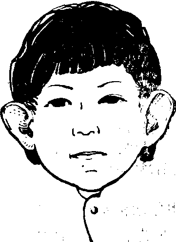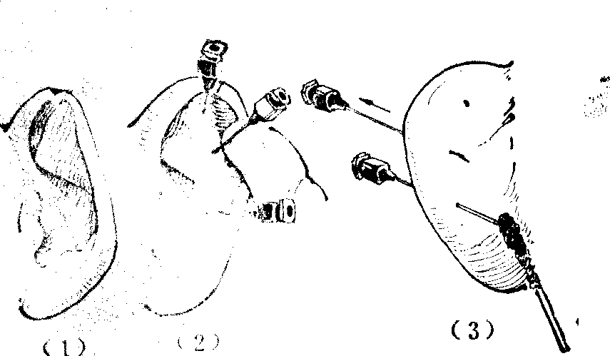 图1 招风耳畸形 招风耳的治疗,如试用敷料塑形加压包扎矫正的非手术疗法,须及早开始,并需坚持数年方可望生效。因难于取得患儿的配合,多不易施行,故一般都主张采用手术疗法。手术年龄,以在学龄前5~6岁时为宜。但由于耳廓的发育成熟较其他部位为早,和头颅对比早年似显形体较大并向外突出,但有时随儿童的继续成长,比例渐趋适度,发现治疗并非必须,故畸形程度之较轻者,也不宜急于早年施行手术。 手术治疗前应认真分析畸形构成的因素,以便进行有针对性的矫正。不可不加分析的一律采用在耳后沟部切除一部分皮肤或还包括一块梭形耳甲软骨后直接缝合的简单方法。此种方法,除对畸形系由少见的单纯耳甲后壁过高所致者外,难以奏效。一般多须根据畸形的出现原因常系由于舟甲角过大所致的道理,而采取在恰当的部位形成圆钝隆起的对耳轮及其后脚为主的手术方法。如同时存在耳甲后壁过高,或耳垂向外伸展的导致畸形因素,也需同时矫正,才能达到全面彻底的修复。 术前须经正确的检查,以测定形成对耳轮及其后脚的准确位置,有无耳甲后壁过高的因素存在。检查者用手指向后轻压耳舟部,使耳廓整体和颅侧恢复到正常角度时,即可见圆钝的正常对耳轮及其后脚的形态在原为扁平的耳廓面上自然的突露出来。在此情况下同时观察耳甲外缘,如见耳甲外缘显著突出,或还见耳垂过度向外伸展,都是耳甲后壁过高的表现。通过检查也可初步测定在耳后应该切除的多余皮肤范围。 手术开始时,先将按照上述方法所测定的对耳轮及其后脚的位置,用龙胆紫溶液沿其走向的中央线在耳前面皮肤上标画清楚,并根据手术需要,选择几个部位,以注射针头由前向后刺穿耳廓,在刺入和抽出耳廓前,针尖均用龙胆紫溶液涂过,这样就在耳廓前、后面皮肤及软骨面上,留下供术中识别的明显的着色紫点(图2 )。