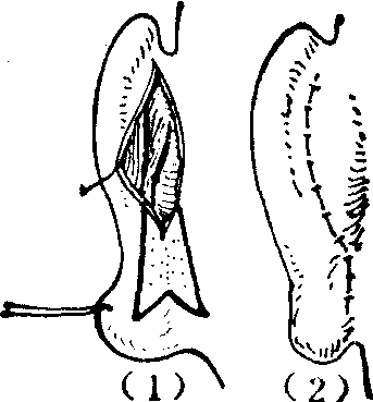 图3 软骨条切除缝合法(横断面) (2)软骨平行切开法。沿对耳轮及其后脚的走向,在软骨上作数条平行而不切穿前侧软骨膜的切口,以折断局部软骨的弹性,便于将切开区两旁的软骨膜缝合后,可以形成较圆钝的隆起(图4)。