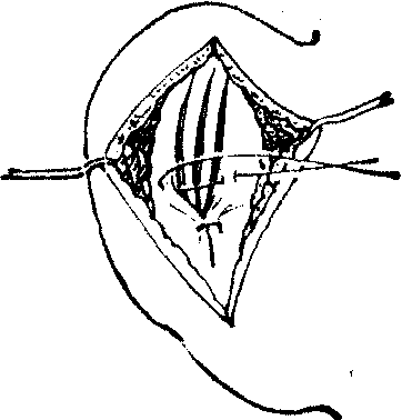 图4 软骨平行切开法 (3) 软骨褥式缝合法。在对耳轮体部、前后脚分叉的稍下方和后脚等部位,各由后向前,用0~1号丝线,行穿透软骨、前侧软骨膜,但慎勿穿透耳前皮肤的横褥式缝合,在适当的张力下结扎,即可使局部软骨卷拢形成圆钝的隆起皱襞(图5)。此法既简便易行,疗效也较可靠。为便于褥式缝合的操作,也可在耳前侧皮肤上的相应部位作几个很短小的辅助切口。但须注意将切口与缝线所在部位稍行错开,以免日后因缝合创口瘢痕日渐薄弱,可能发生缝线外露。