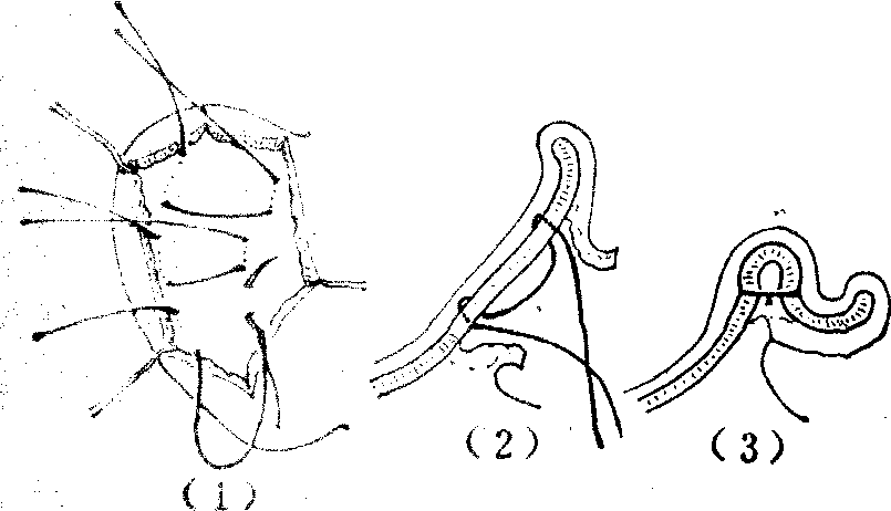 图5 软骨褥式缝合法 (4) 软骨管法。沿对耳轮及其后脚的后缘,后脚的前缘,和后脚的上缘,作互不连接的三条软骨穿透性切口,但保持前侧软骨膜的完整。然后缝合成不完全的管状。如软骨较厚,可从后侧将局部软骨以钢丝刷磨薄,或用刀片削薄,以易于卷拢(图6)。