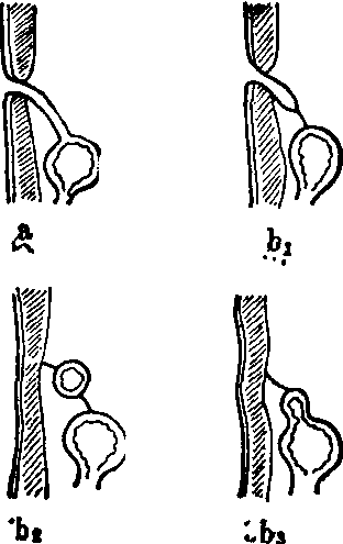 图1 脐肠管异常示意图 脐尿管的先天性异常与此相似,相应的畸形为脐尿瘘 (图2,a)、脐尿管窦(图2,b1)、脐尿管囊肿(图2,b2)、脐尿管膀胱憩室(图2,b3)。这些先天性异常的临床表现是婴儿脐带脱落后脐部经常有分泌物,脐粘膜息肉、脐部的窦和瘘都有这种症状,但脐瘘外口有时可见肠内容物或尿液流出。X线窦道造影可用于鉴别诊断。囊肿一般较小,仅于继发感染时才出现症状。索状带一般无症状,但有可能引起肠梗阻。这些病变的治疗是手术切除。