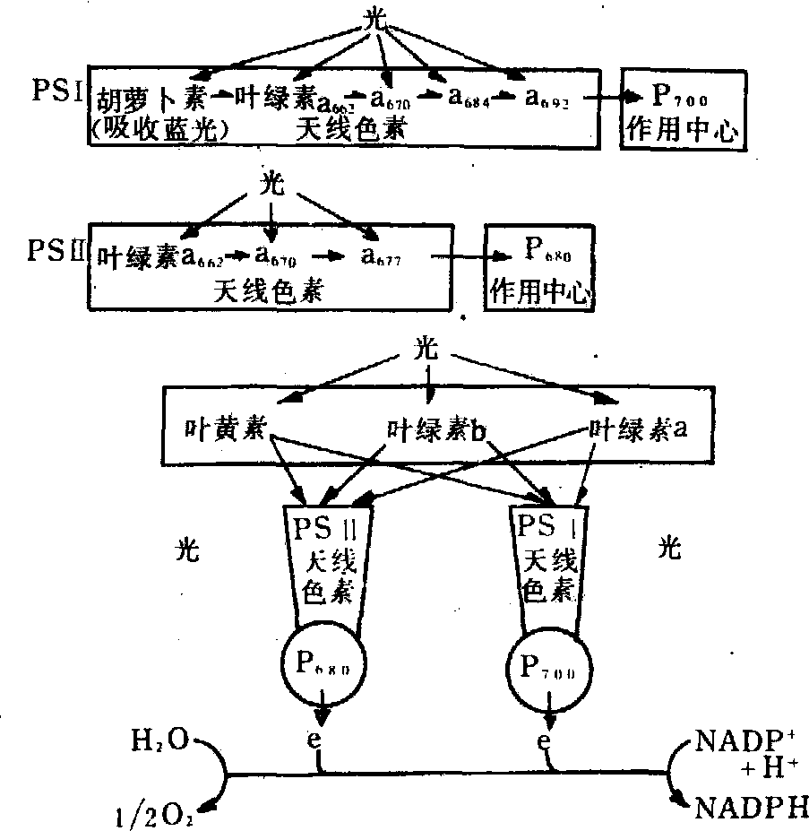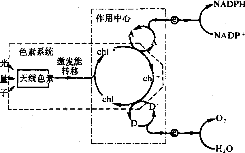 图 2 光能在色素分子间的传递 反应中心色素分子的光化学反应 光系统Ⅰ的反应中心色素分子吸收可见光的峰值是在700nm故称P700。光系统Ⅱ的反应中心色素分子吸收可见光的峰值是在680nm故称P680。反应中心还具有一个原初电子受体和一个原初电子供体。当反应中心色素分子受光激发时,激发态分子具有很高的能量,并且极不稳定,它随即放射出一个高能电子,在高能电子被原初电子受体接受时就发生电荷分离而实现能量转化。PSI的电荷分离是在P700和X之间进行的。PSII的电荷分离是发生在P680和去镁叶绿素之间。P700或P680射出电子后自身成为氧化态叶绿素a,原初电子供体可以向它提供电子,使其恢复到原来的状态(图3)。由此可见,光合作用的原初光化学反应实质上是一个氧化还原过程。