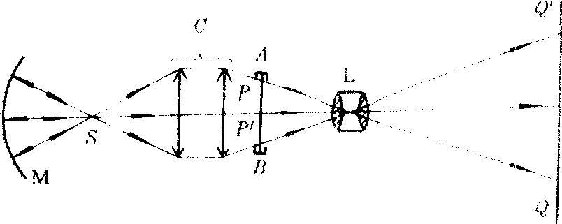 | 释义 | 光学投影系统 光学投影系统guangxue touying xitong为物体提供适当照明并在屏幕上成放大实像的光学系统。简称投影系统。是幻灯机、书写投影仪和电影放映机等投影光学仪器所采用的光学系统。待放大的物体一般是载有文字或图像的透明片。投影系统的主要组成部分是光源、聚光器、物体夹具、投影物镜和接收屏幕。图中示出了幻灯机的组成和光路原理,这是一个典型的投影光学系统。光源S通常用白炽灯或弧光灯,应能提供充分的照明,为延长灯泡的寿命,多采用风扇冷却。凹面镜M和透镜组C联合组成聚光器,使用这种较复杂的聚光器是为了把光源发出的光尽可能多的聚集起来,对物体PP′尽量均匀照明并透过投影物镜L。光源通过聚光器所成的像应位于物镜处,并且该成像光束应恰好照遍物体。物体夹具AB把物体PP′精确定位在物镜前焦点外一合适的地方,物体的微小移动都会降低像的清晰程度。投影物镜L使物体PP′在屏幕Sc上成一放大倒立的实像QQ′。为了矫正各种像差,物镜常由两个或两个以上的透镜组成。不同需要可选用不同的物镜,例如,投影物体轮廓和外形的投影仪,物镜应较好地矫正畸变和像场弯曲;放映用物镜应能耐热,故通常不使用胶合透镜。