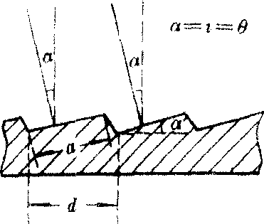 光栅刻槽面与光栅平面成α角,刻槽面是反射面,相当于普通光栅的透光部分转了α角。这种光栅所生各级衍射条纹位置仍由光栅方程决定而不受刻痕形状影响,但单狭缝衍射的中央明纹位置却在刻痕形状决定的反射光方向上,在此方向上的条纹变强,或称炫耀。从光栅方程知道,若入射光沿槽面法线方向,则被炫耀光谱的波长λB满足2dsina=KλB。习惯上说某光栅的炫耀波长都指K=1时的λB,所以λB=2dsinα。美国人罗兰1888年就指出过,利用刻槽有一定形状的反射光栅可将衍射光集中在某一级条纹上。R.W.伍德1910年做出了第一块用于红外的、刻槽有一定形状的光栅。现代优质光栅的d≈a(即b很小),可把近80%的光能集中到所需的λB上去。另外,作为一个指标,光栅的炫耀波长总是指一个波段范围,该范围两端的波长一般取λB±λB/2。