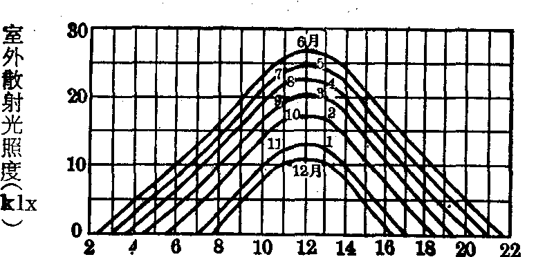 | 释义 | 光气候 光气候光气候是一项气象因素,是指示某地区一年的不同月份中,各小时的平均室外散射光照度的变化情况。可根据多年对某地区室外水平面上照度的测量资料,分别不同月份,以各小时为单位,算出该月内同一小时各天室外照度的平均值,再以一天24h为横轴,照度为纵轴,画出月份曲线,即为该地区的光气候图(见图),利用光气候图,有助于规划建筑物的天然采光,以保证居民的良好视觉条件和视觉生理要求,保护居民健康。