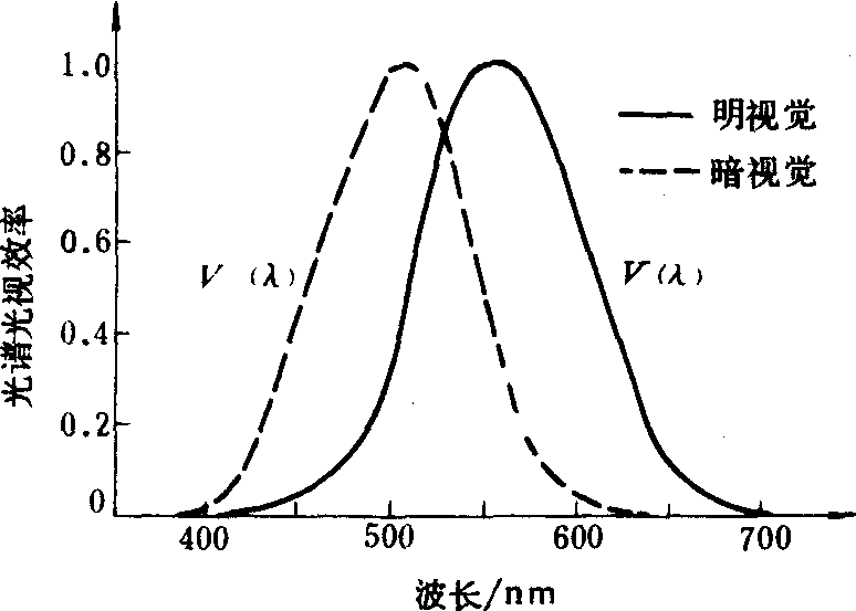 光谱光视效率guangpu guangshi xiaoluluminous efficiency在全亮适应条件下, 人对各种波长光所感受的平均相对灵敏度。简称光视见效率, 旧称视见函数。 在光辐射中, 有一部分是人眼能够看见的。因为在人眼的视网膜上布满了大量的感光细胞。感光细胞有两种, 柱状细胞和锥状细胞。柱状细胞的感光灵敏度高,能感受极微弱的光: 锥状细胞感光灵敏度较低,但能很好地区别颜色。在这两种细胞里都含有一种感光物质。当光线照到视网膜上时, 感光物质会发生化学变化, 刺激神经细胞, 由视神经传到大脑, 产生视觉。实际上人眼对各种颜色光的灵敏度是不相同的,对绿光的灵敏度最高,而对红光则低得多。也就是说,相同能量的红光和绿光, 后者在人眼中引起的视觉强度要比前者大得多。不同观察者的眼睛, 对各种波长的光的灵敏度稍有不同, 而且随着年龄和健康状况以及观察时间而变化。因此, 只能从许多人的大量观察结果中取出平均值。为了实用, 必须采取一个约定的真正代表人眼特性的曲线, 作为光度测量的标准, 以便对不同颜色的光获得一个恒定的单位值光度标。国际上使用的C I E 1924标准, 是对200多个光度观测者测量得出的数据, 后经修正, 1972年国际计量委员会批准明视觉条件下所测得的。图中实曲线表示光亮度大于几个坎德拉/米2时人眼的相对灵敏度,称为“明视觉”的光谱光视效率, 其最大值在555纳米处。当光亮度小于0.01坎德拉/米2时(虚曲线), 人眼的相对灵敏度称为暗视觉的光谱光视效率, 其最大值移向波长507纳米处。